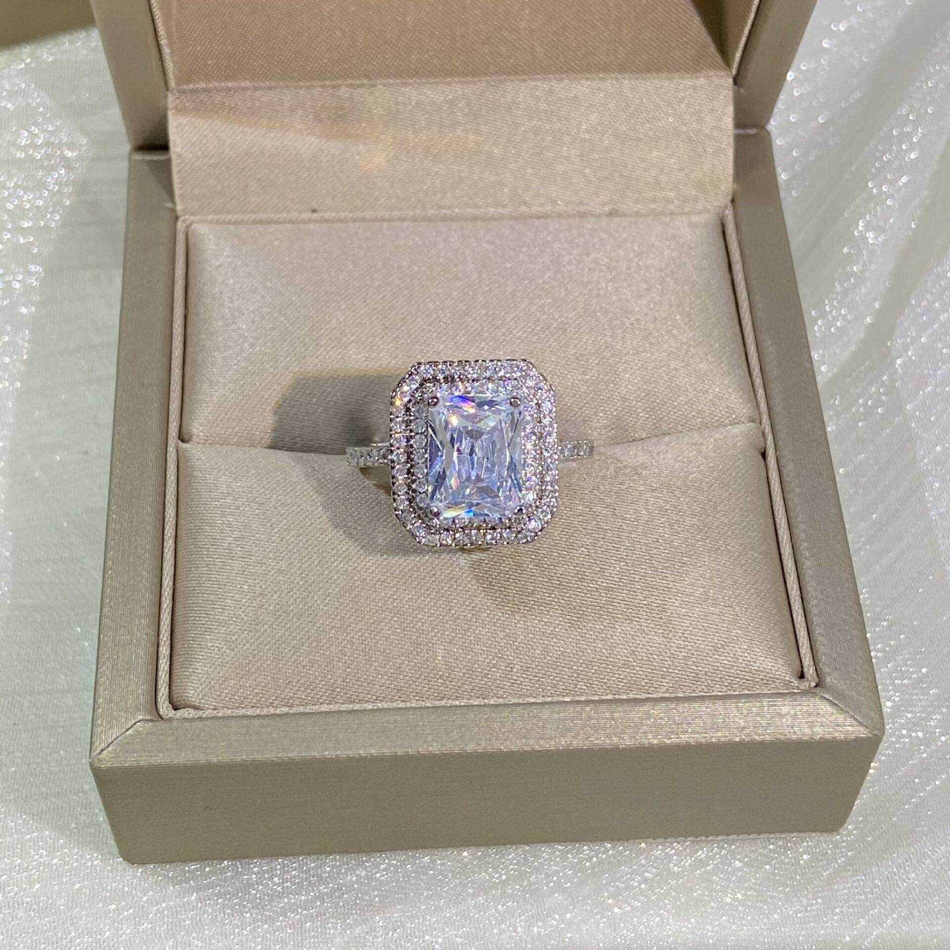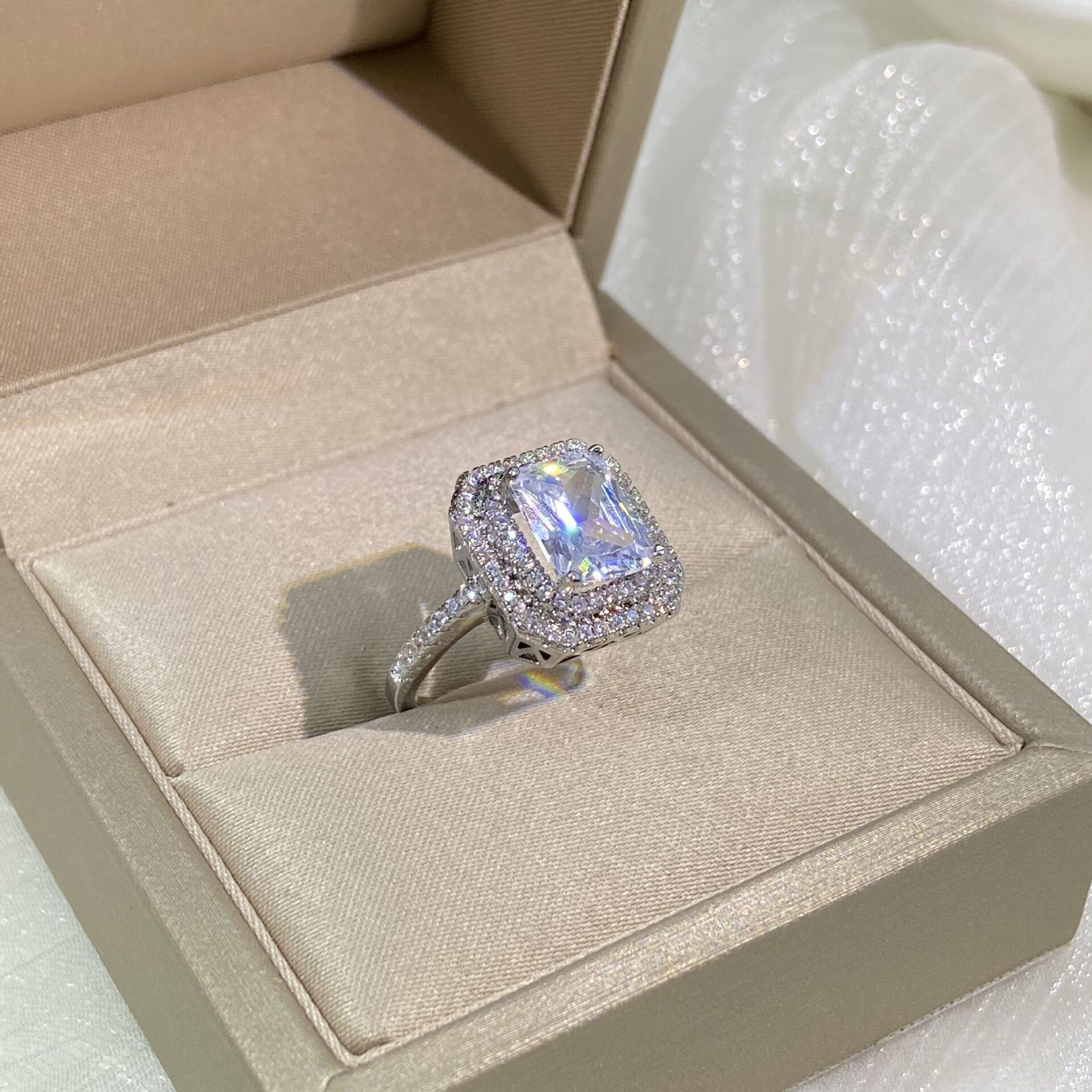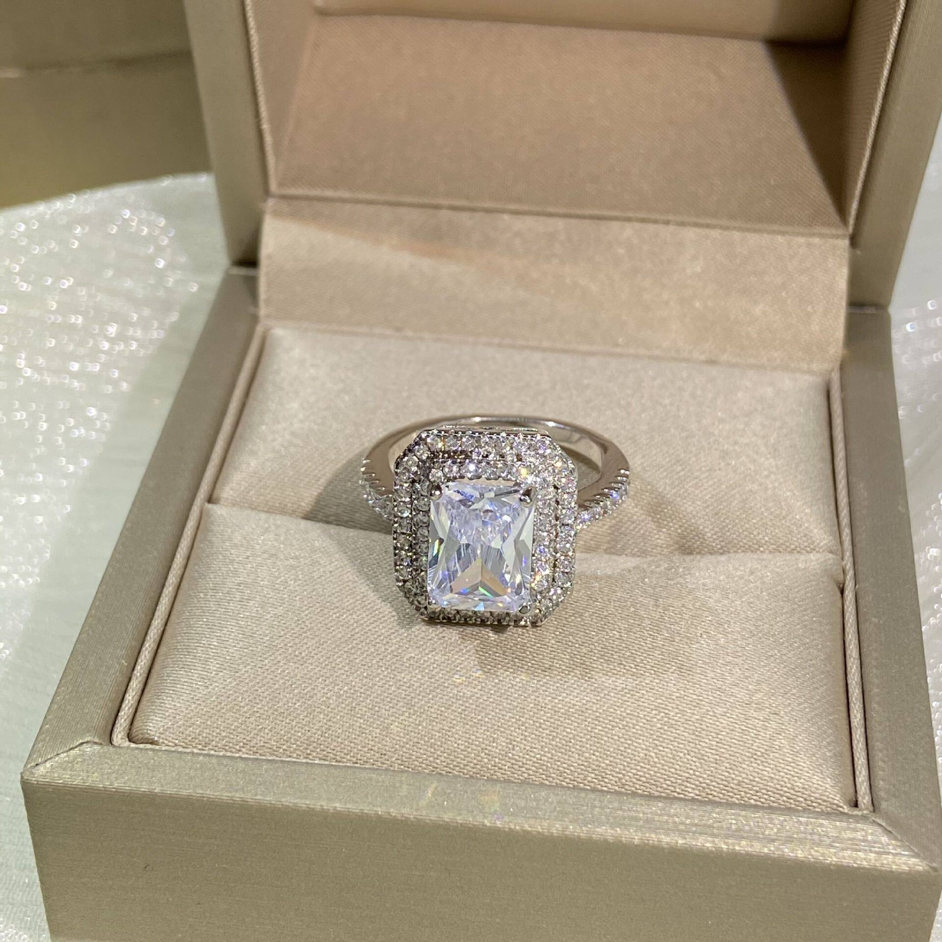欧美高端结婚钻戒少女简约甜美气质公主长方形硞石镶钻镀白金戒指
