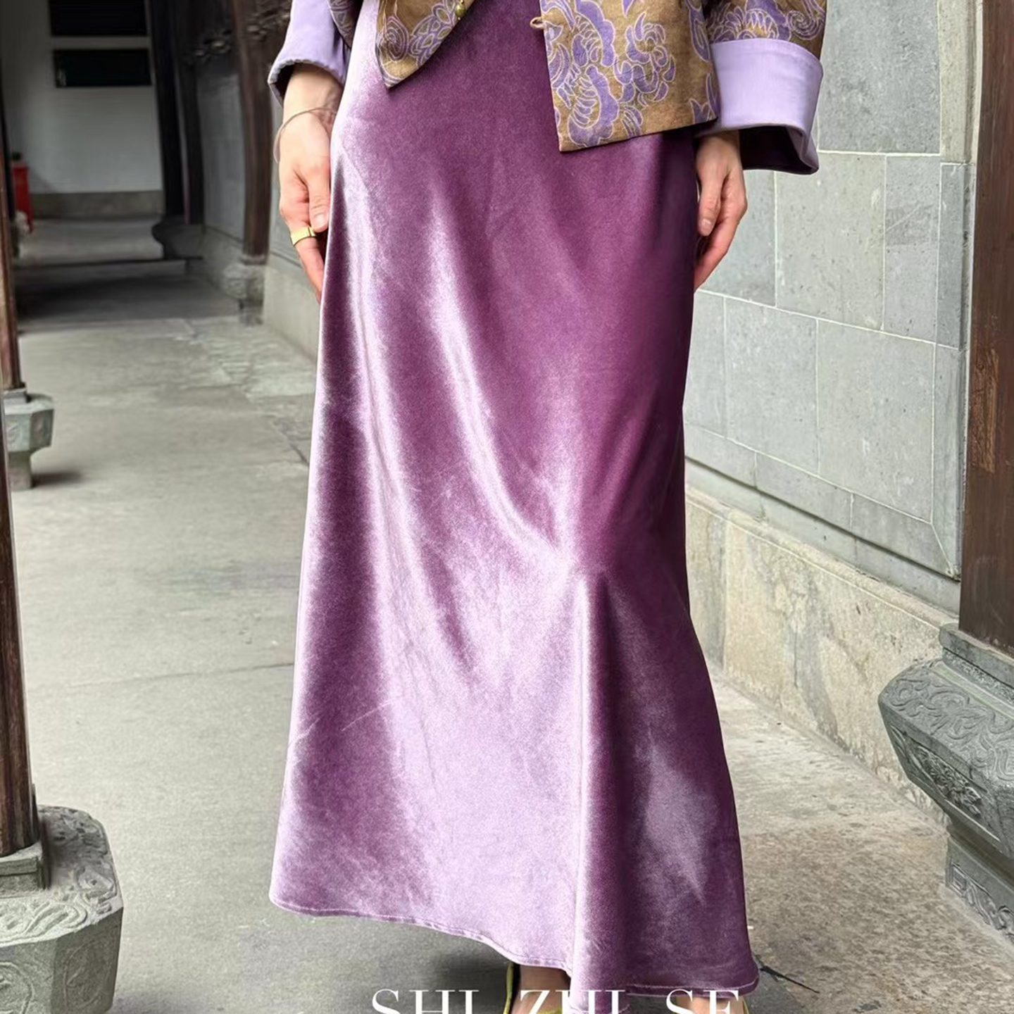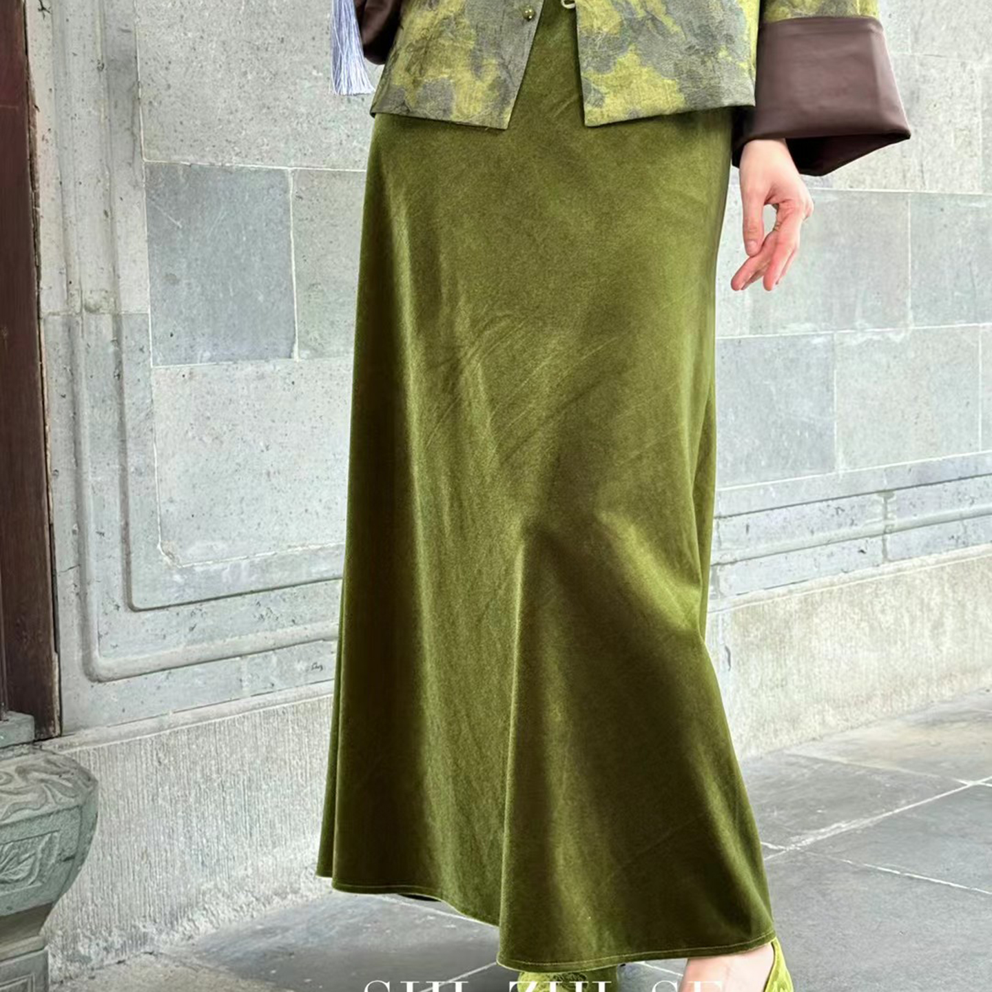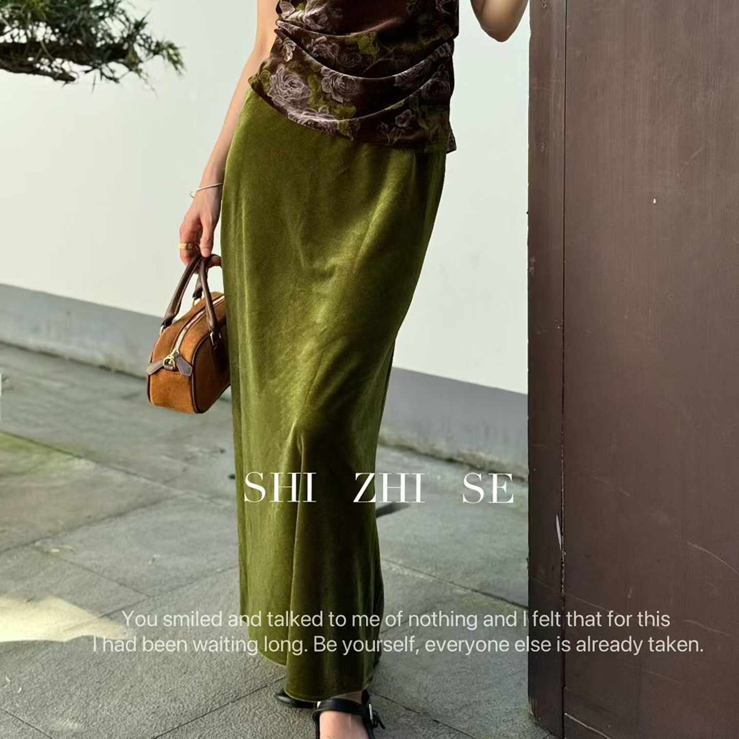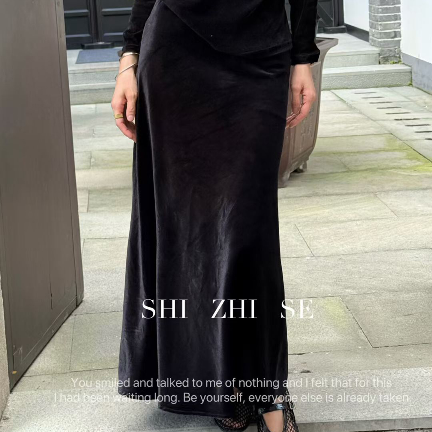 欧洲站秋装新款计师款复古光泽感丝绒包臀鱼尾半身裙A字裙长裙潮