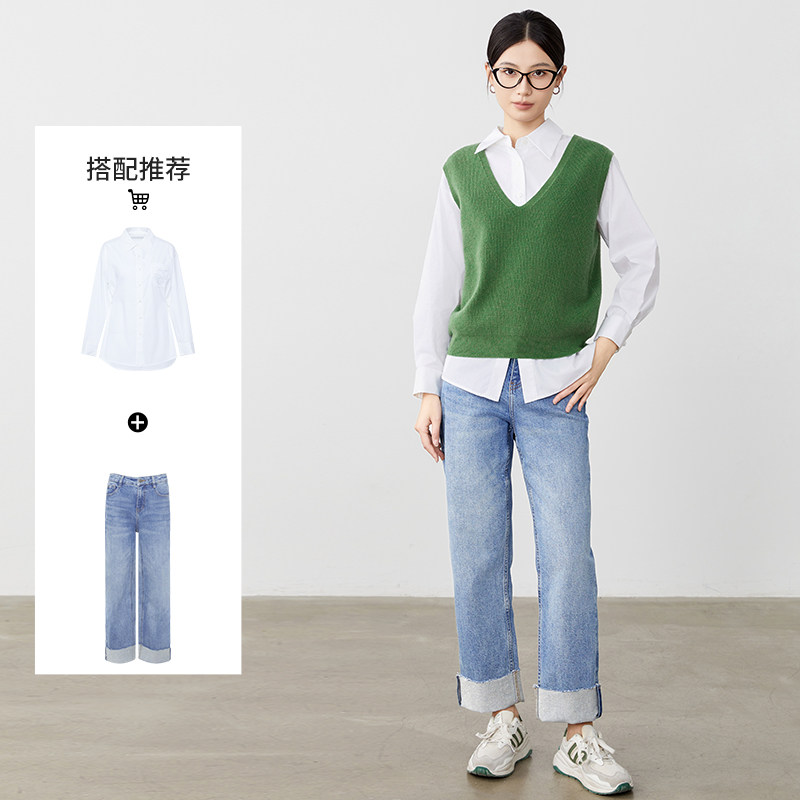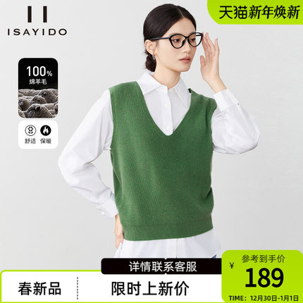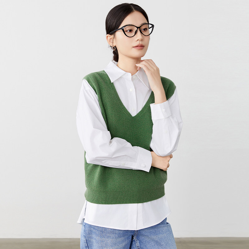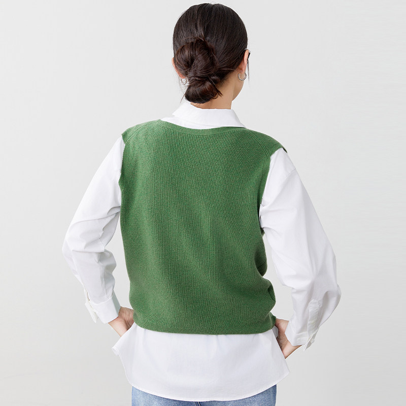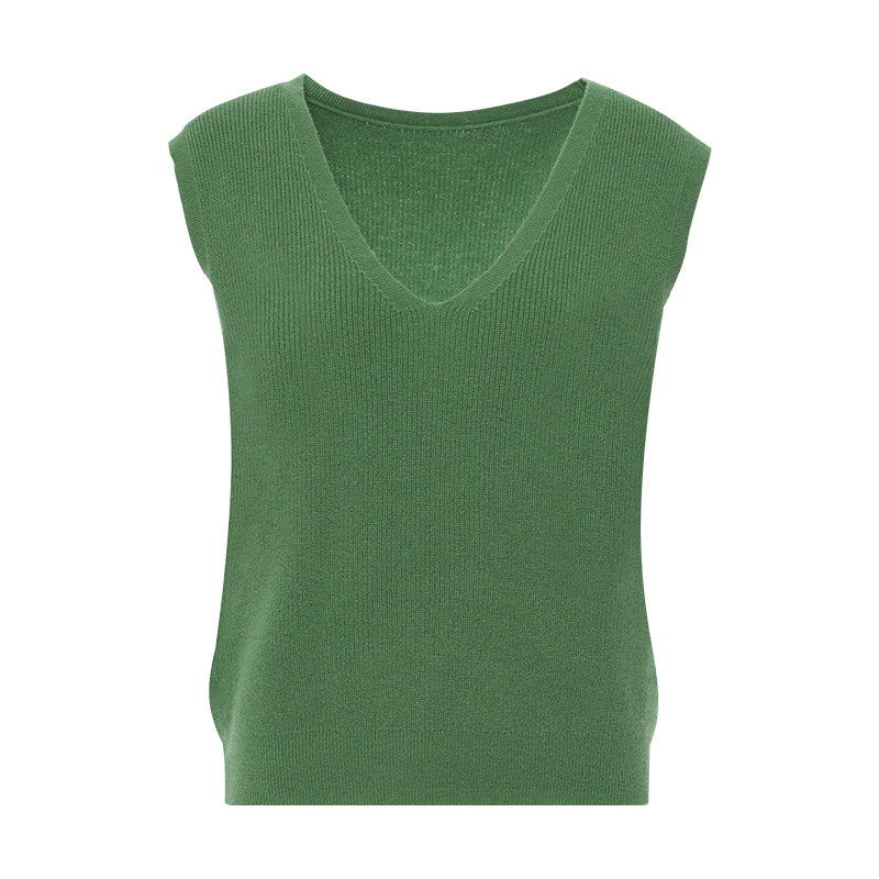 傲丝度V领无袖针织背心女绿色纯羊毛叠穿马甲极简外搭毛衣坎肩