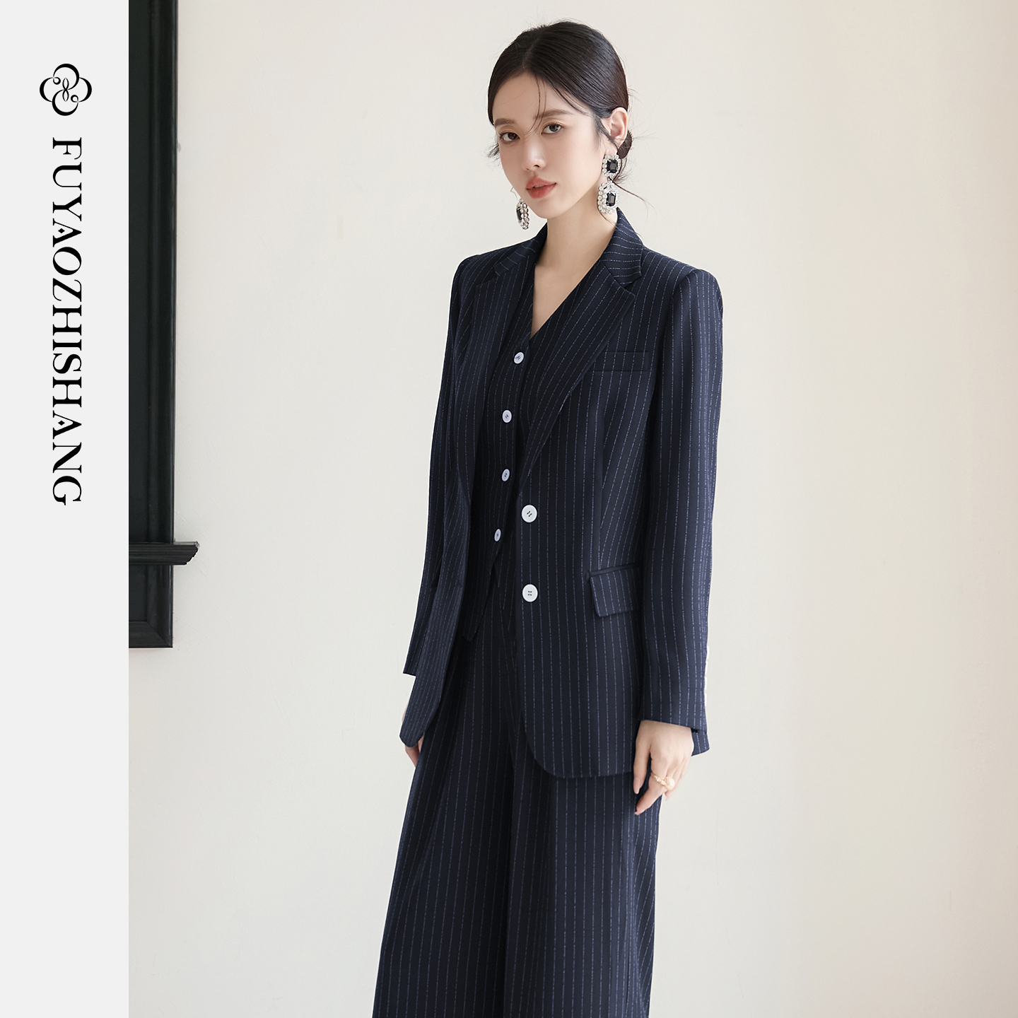 FUYAO扶摇 藏青色条纹西装套装女秋2025新款高级感西服马甲三件套