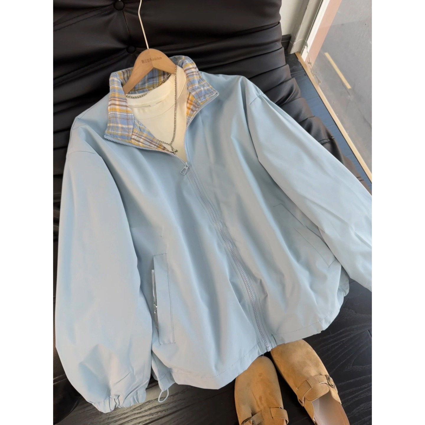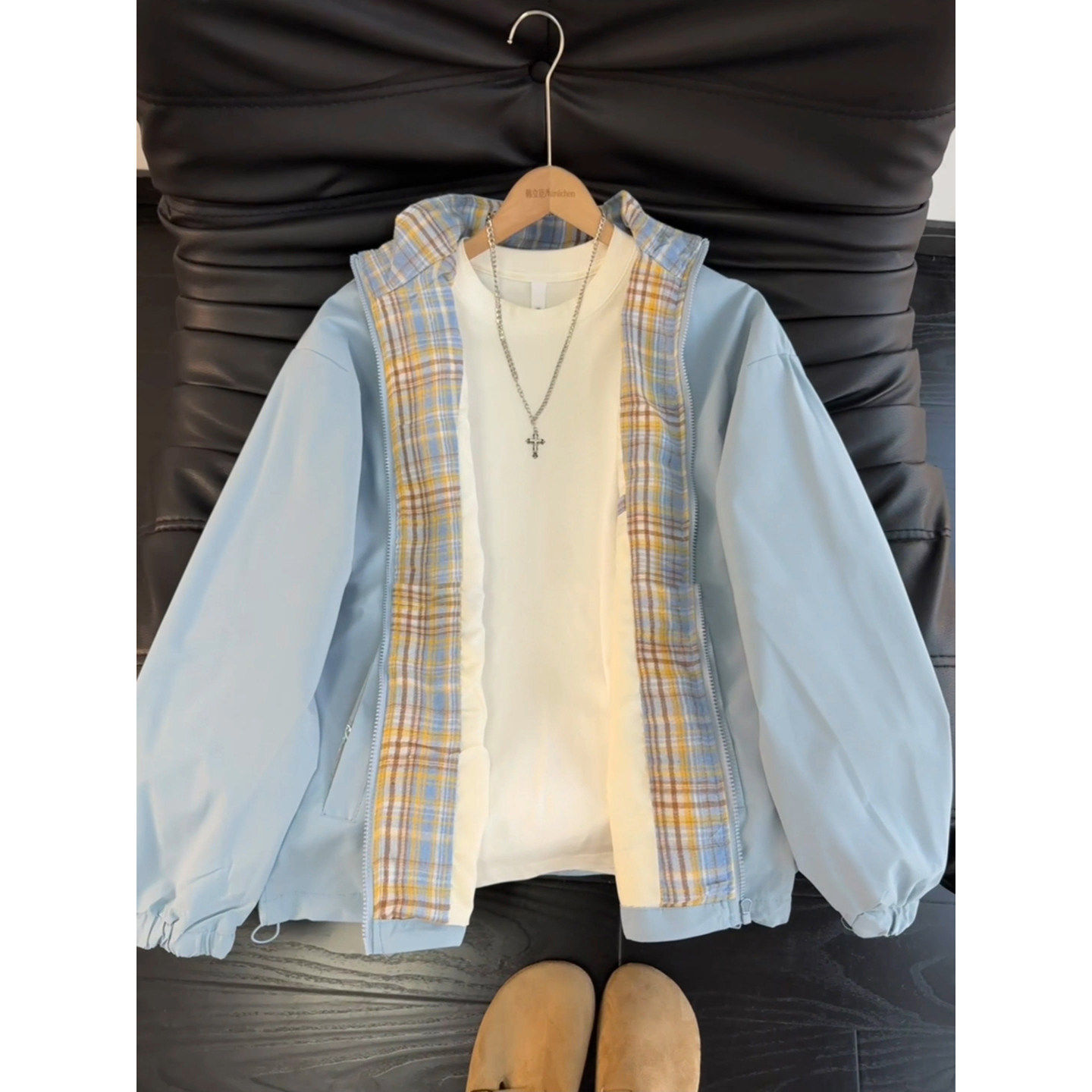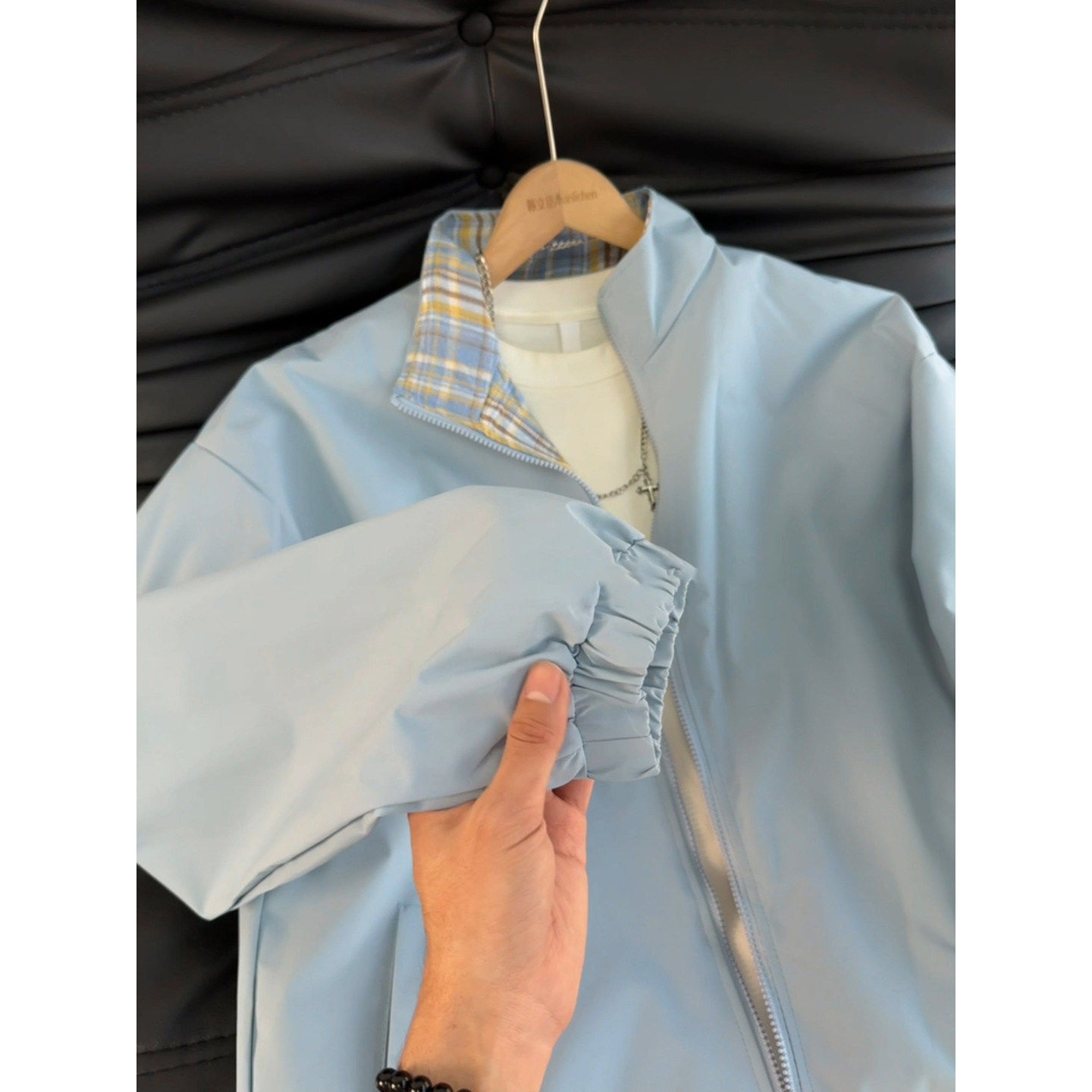 蓝色格子拼接外套男生春季穿搭高级感飞行夹克廓形短款美式棒球服
