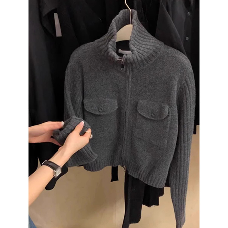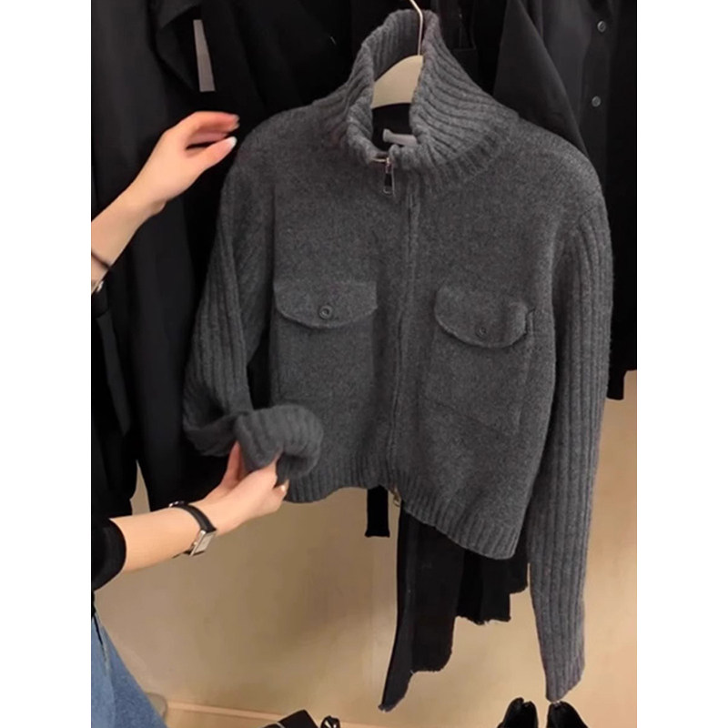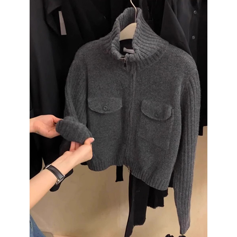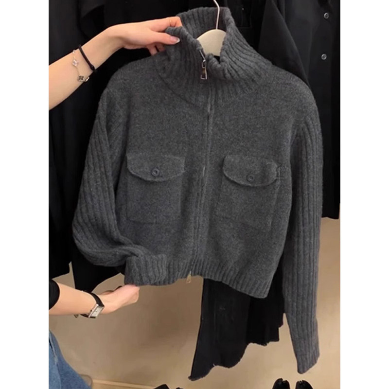 灰色高领双拉链毛衣外套女秋冬高级感宽松针织羊毛开衫短款上衣厚
