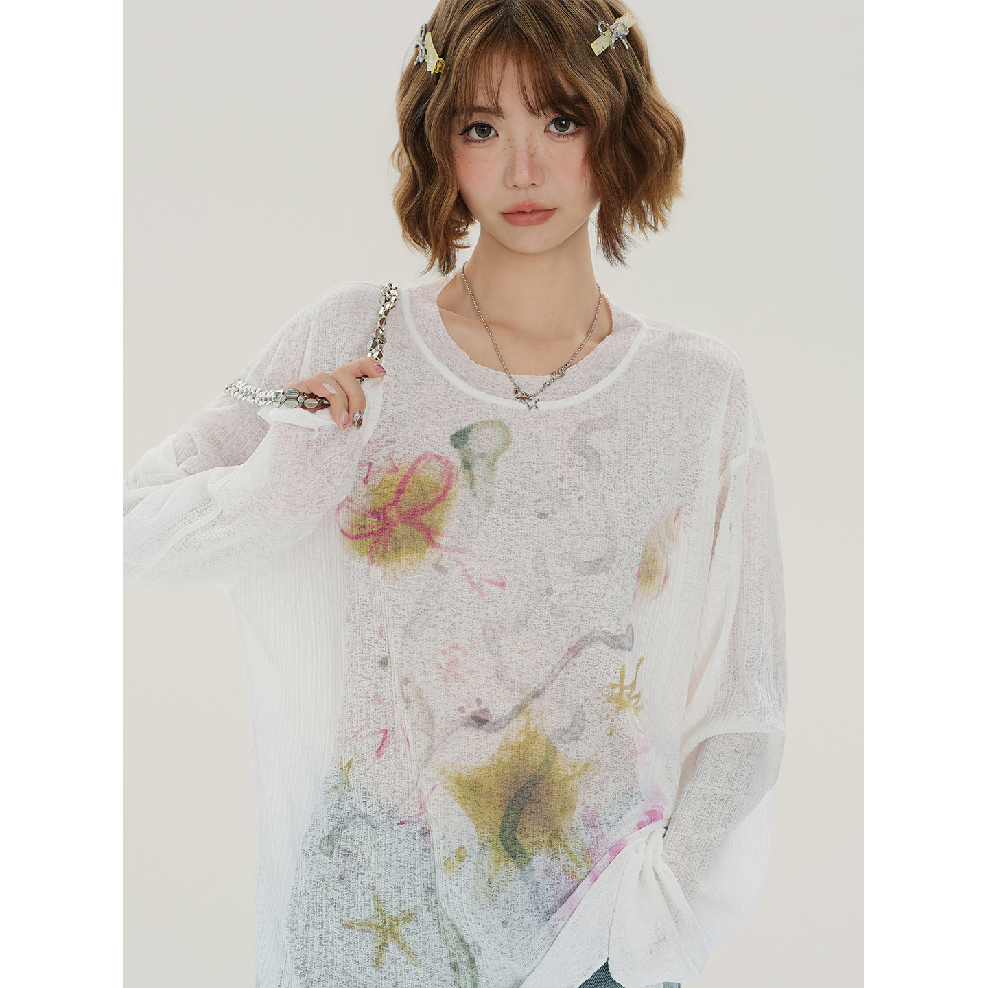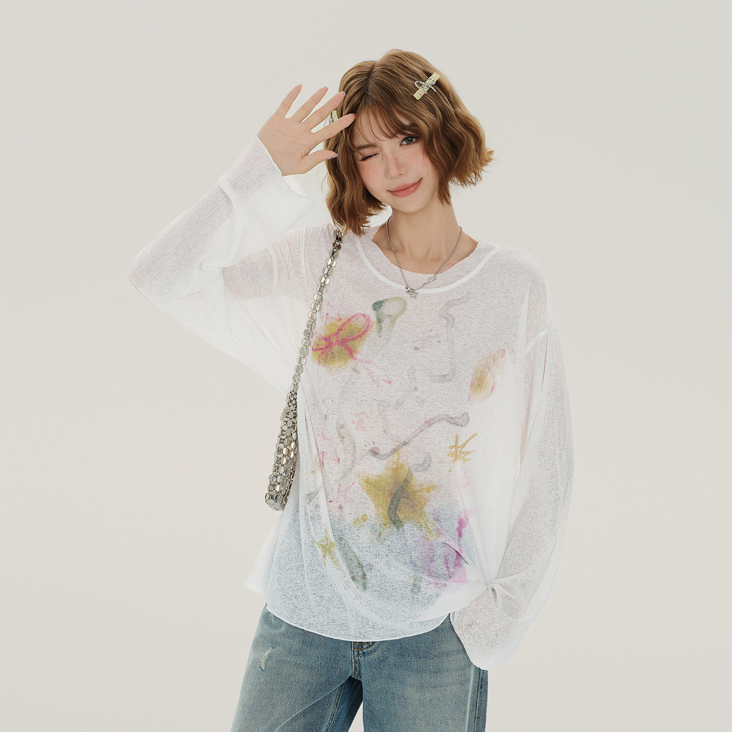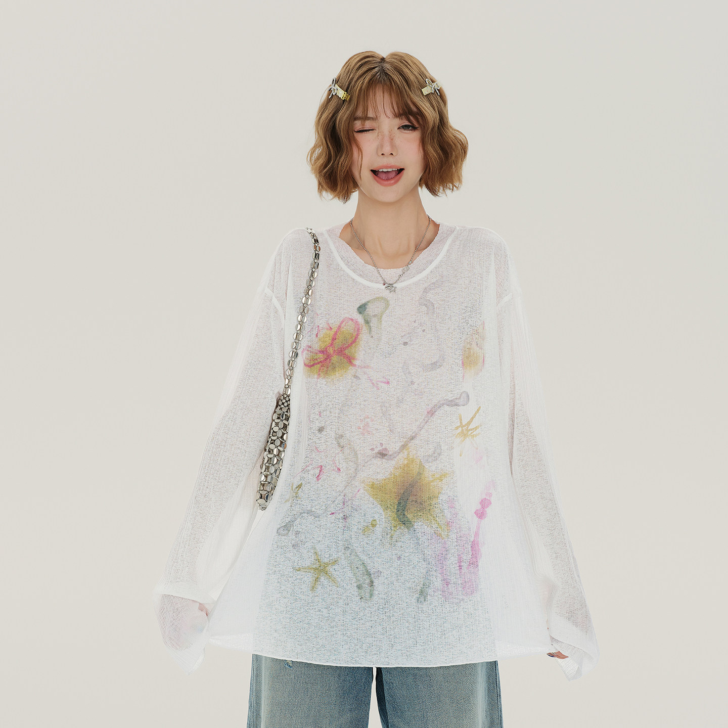 Girlyhalo美式复古印花防晒轻薄长袖t恤女夏季新款宽松透气罩衫女