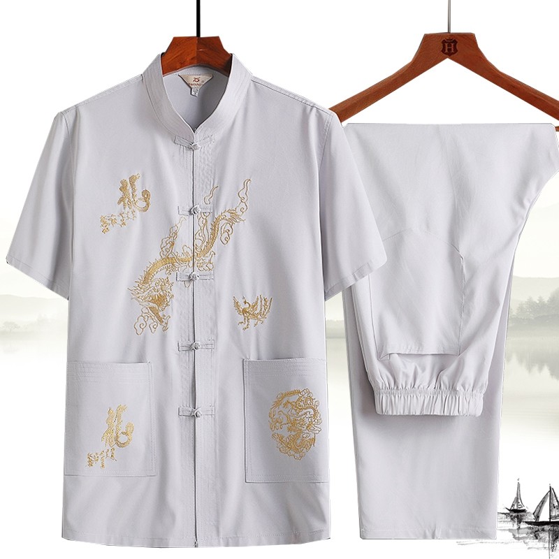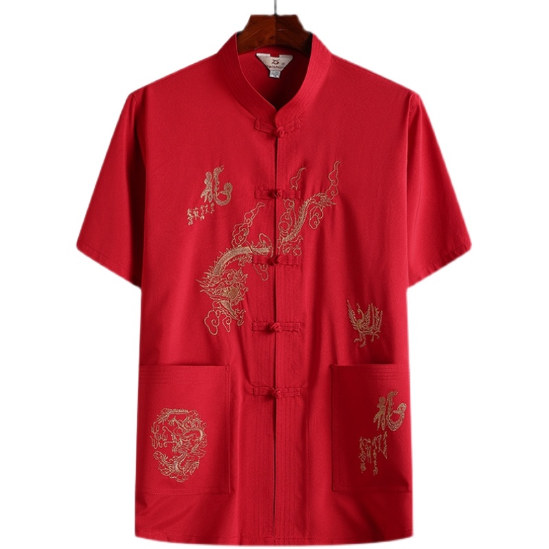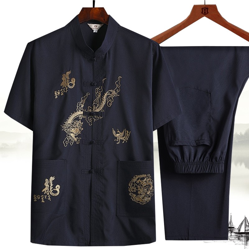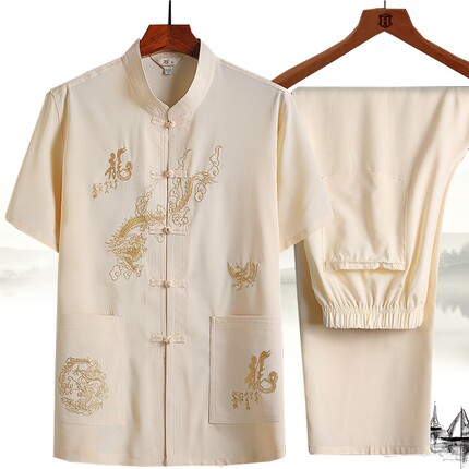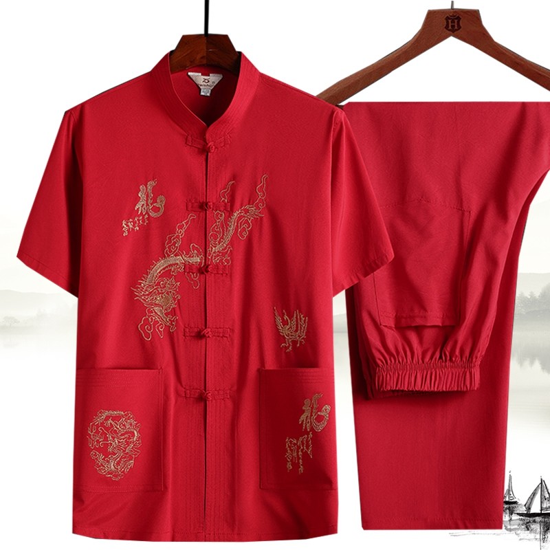唐装男夏季中老年人大码爸爸短袖衬衫套装中式刺绣爷爷装晨练汉服