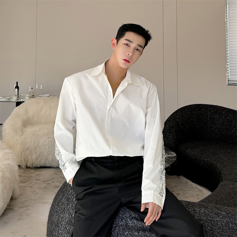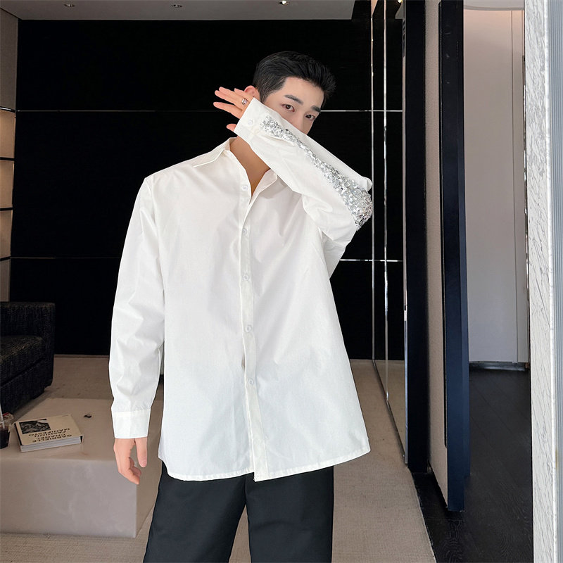 春装高级感小众后背亮片白色衬衫男长袖韩版设计感网红演出衬衣潮
