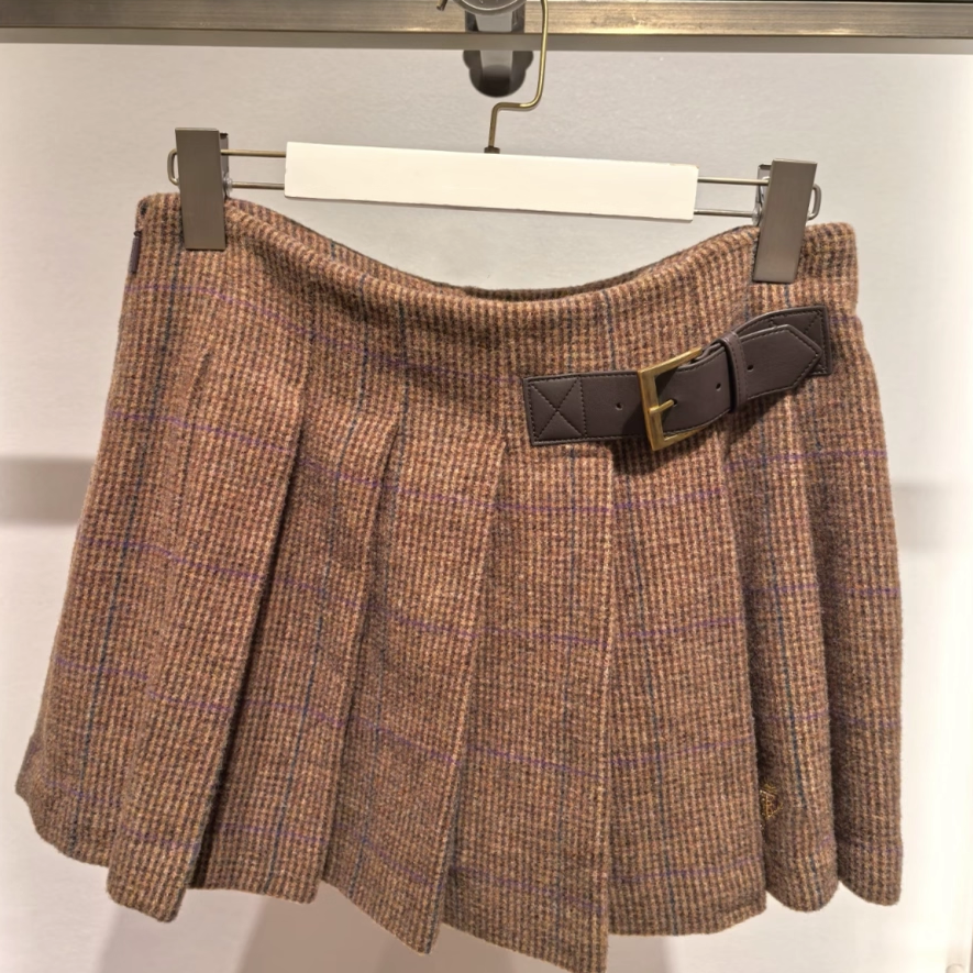 赵露思同款小熊2025秋冬新款羊毛呢百褶半身裙复古格纹高腰短裙子