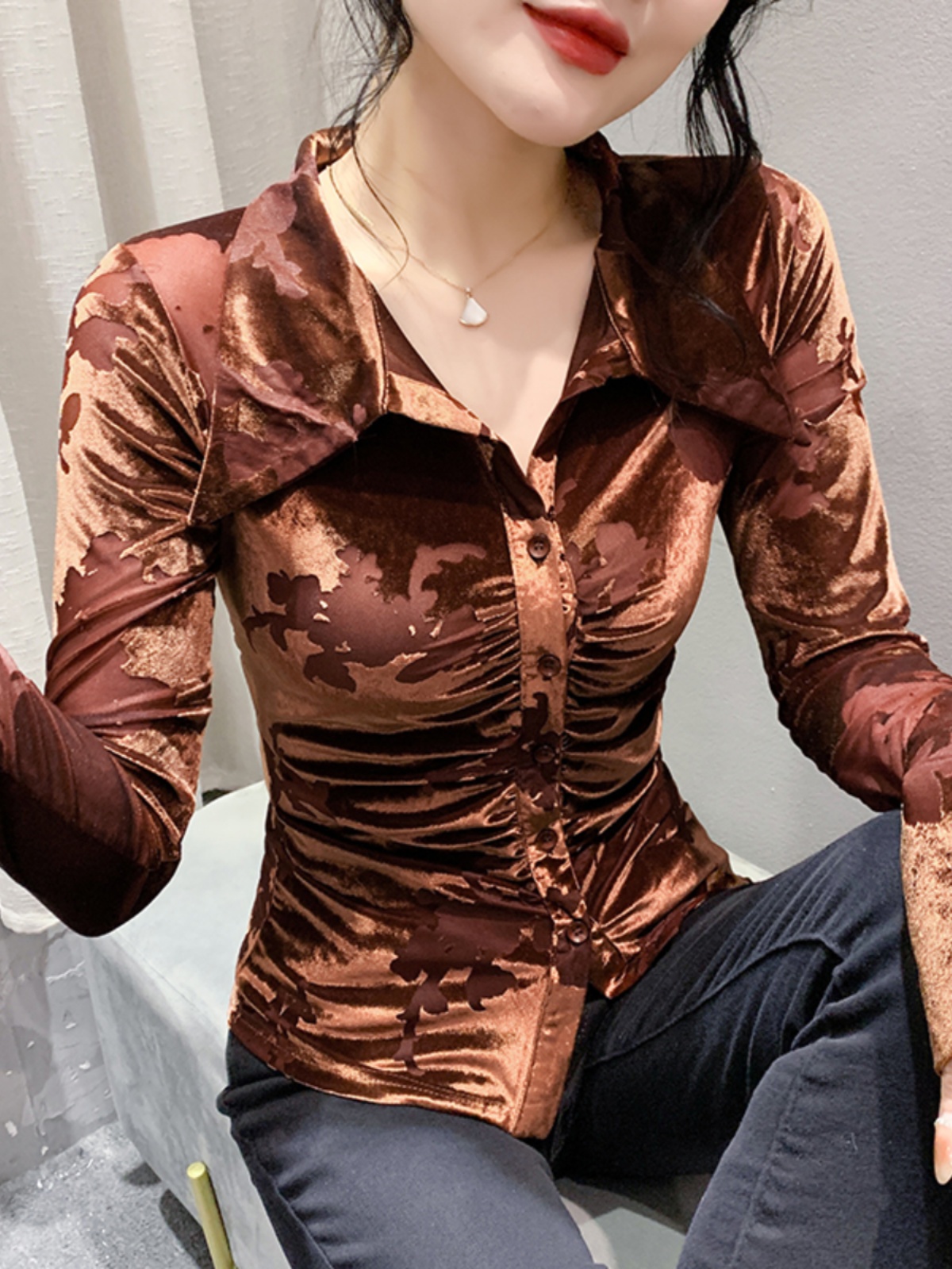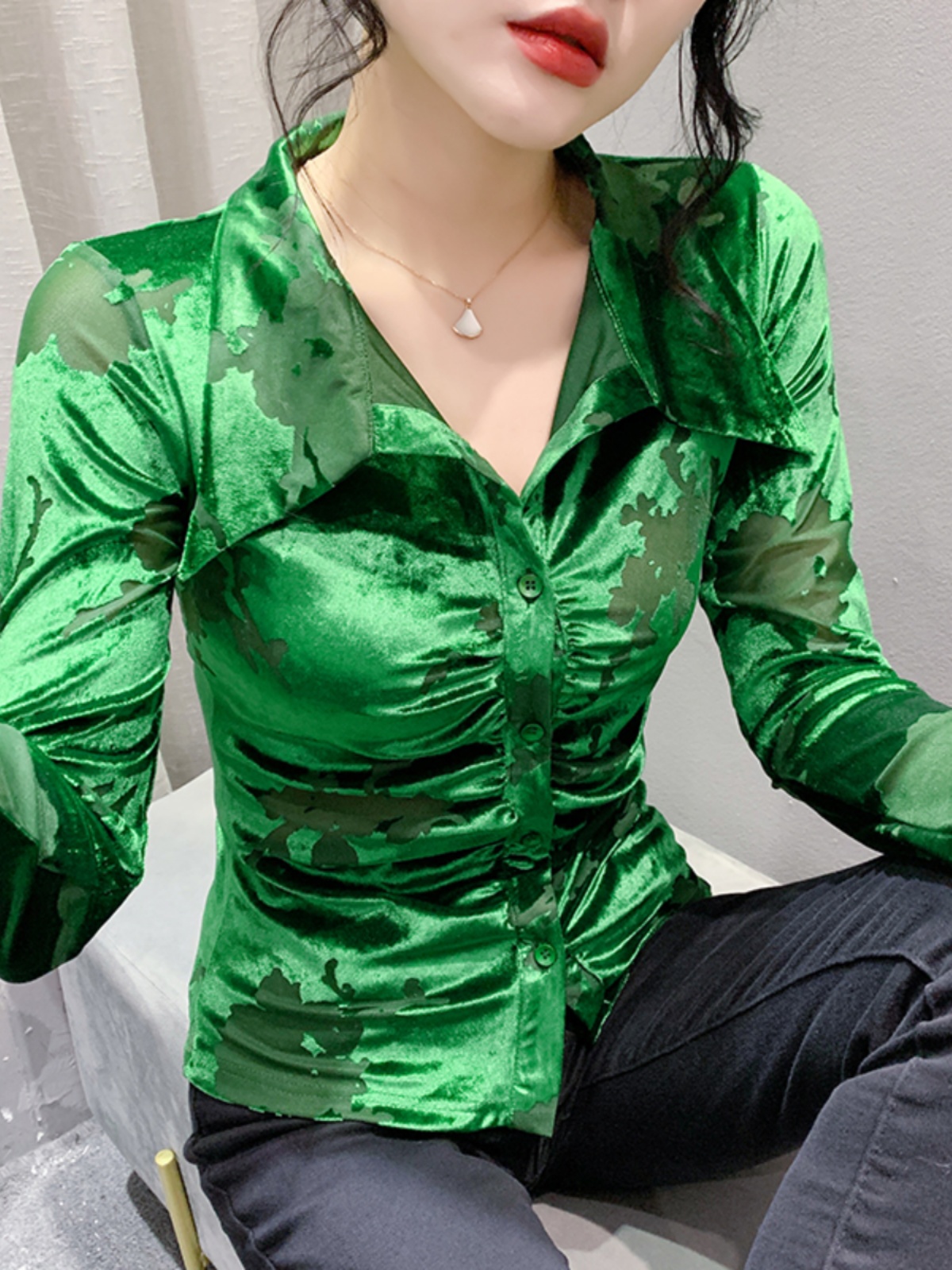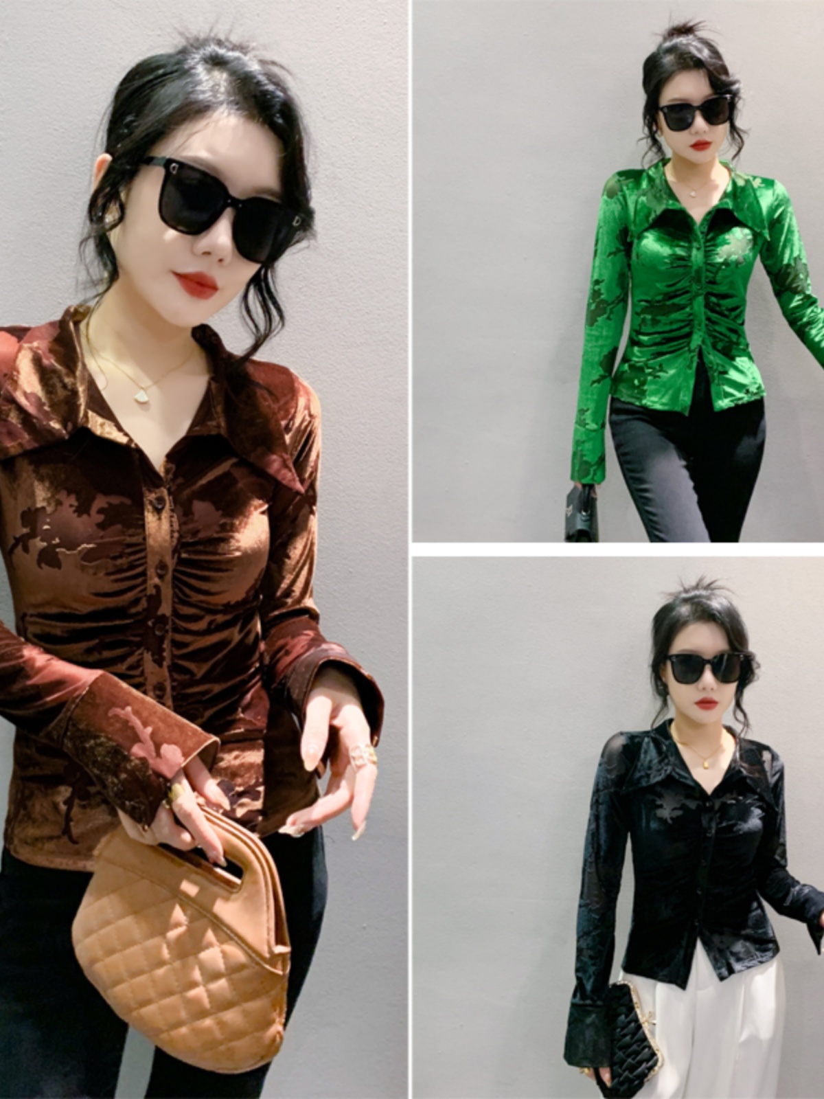 法式时尚洋气气质名媛Polo领网纱丝绒长袖衬衫女春装新款修身上衣