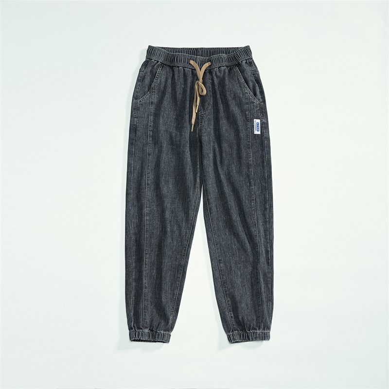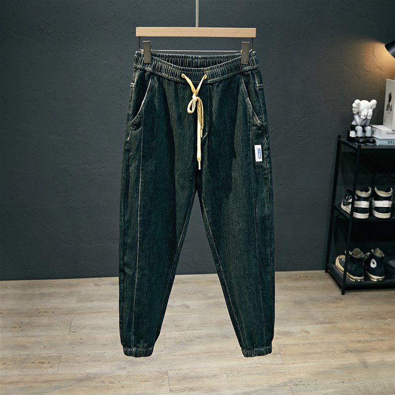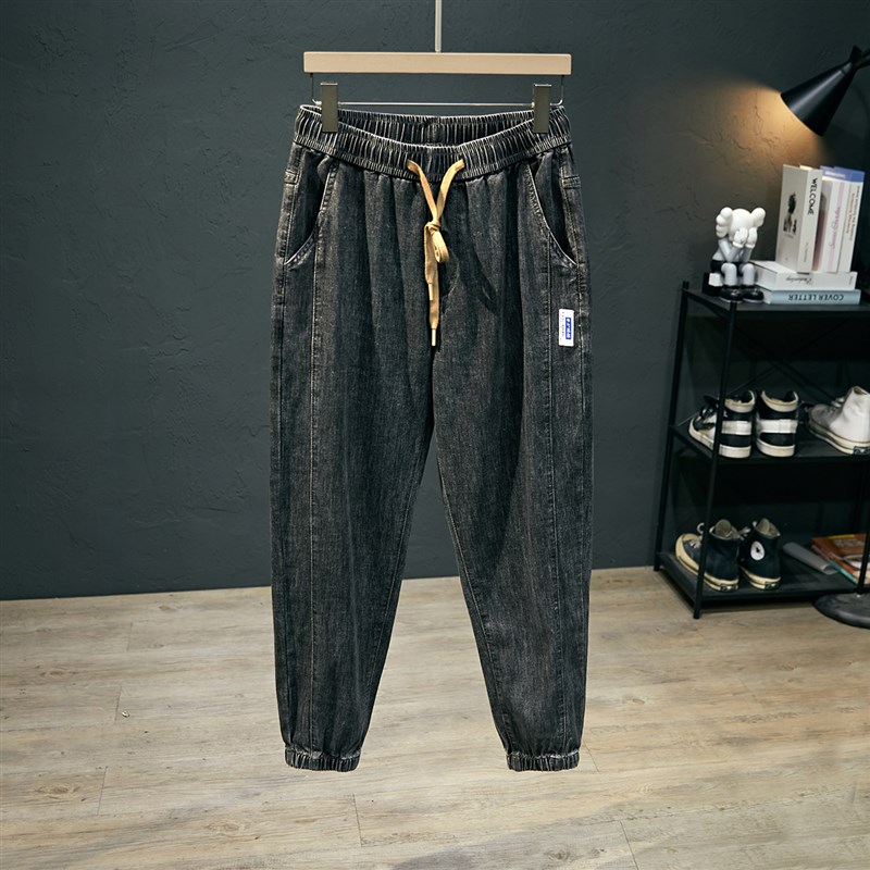 黑灰弹力松紧腰牛仔裤男款宽松大码束脚裤春季薄款休闲哈伦九分裤