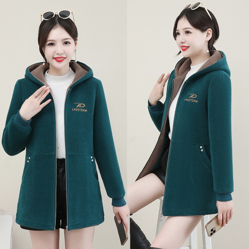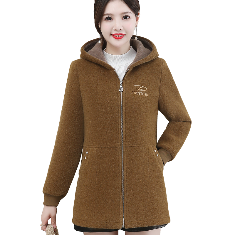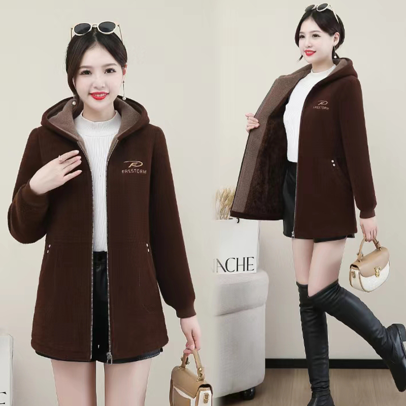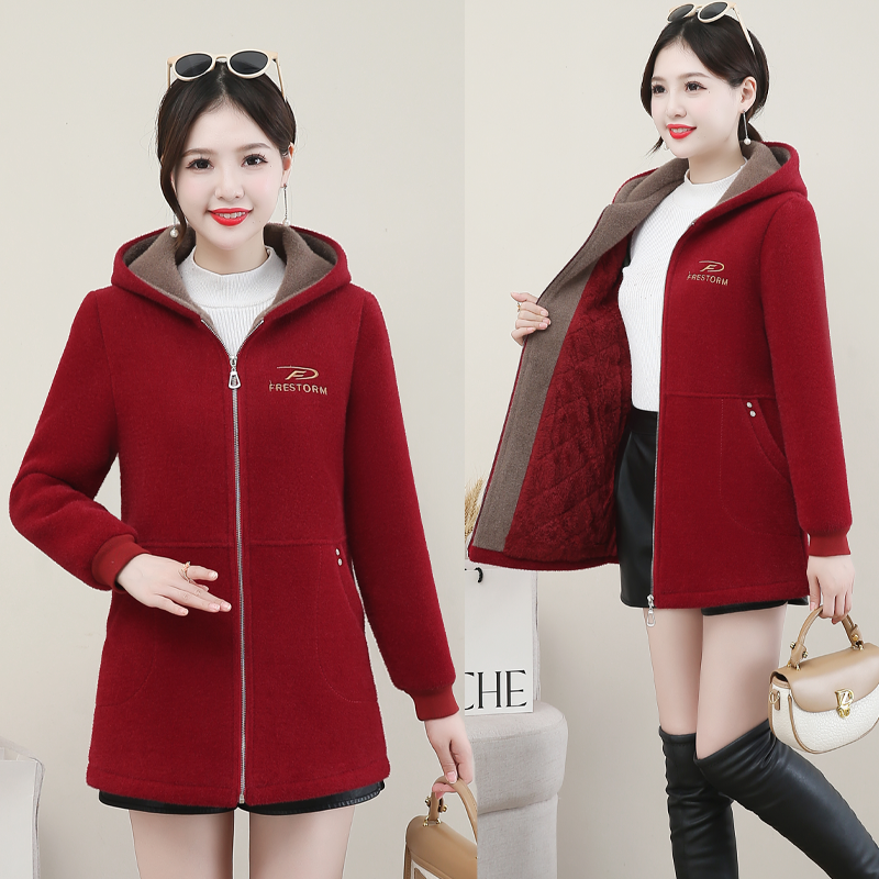 中年妈妈新款加绒加厚连帽休闲卫衣冬季中长款外套修身保暖开衫女