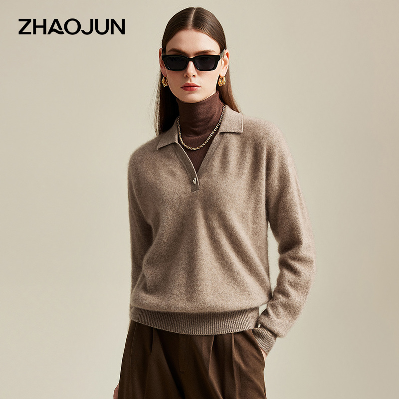 兆君秋冬新款纯色拉毛羊绒衫女翻领落肩袖宽松偏厚针织毛衣