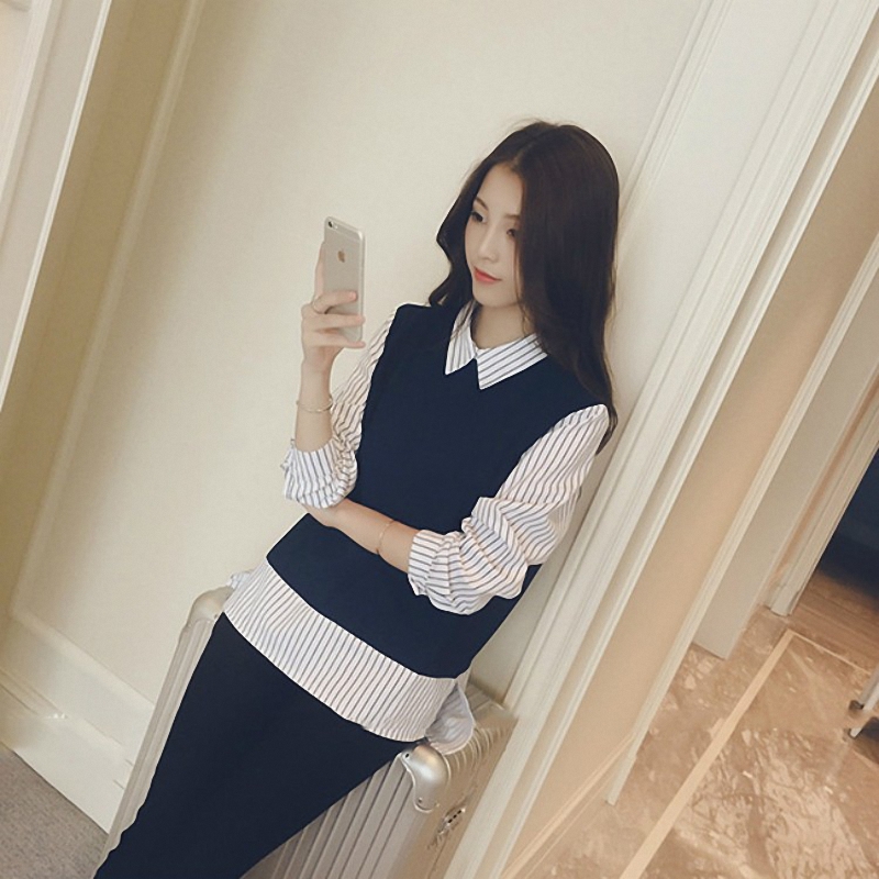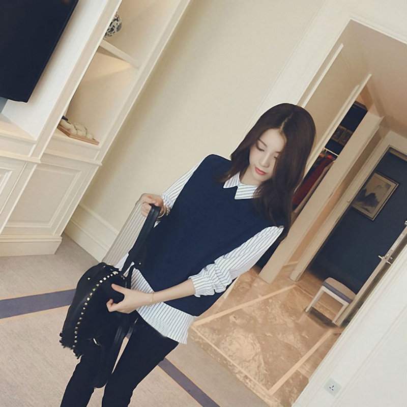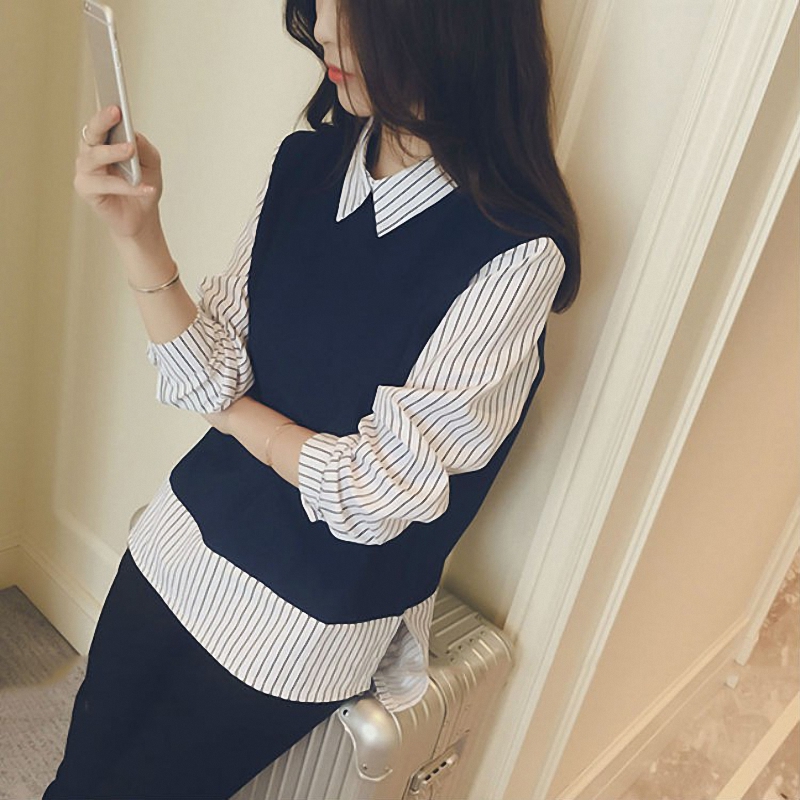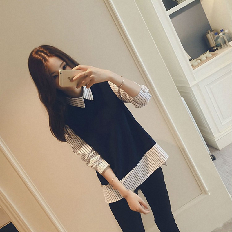 秋冬女装韩版批新款发长袖宽松显瘦打底衬衣条纹拼接假两件衬衫潮
