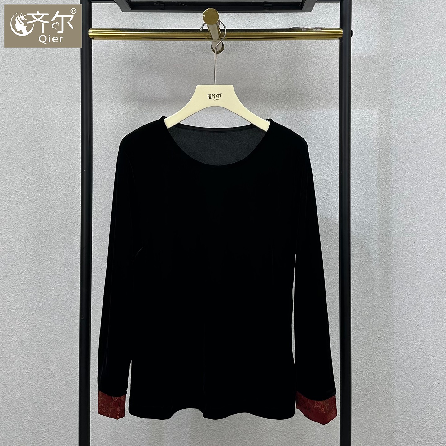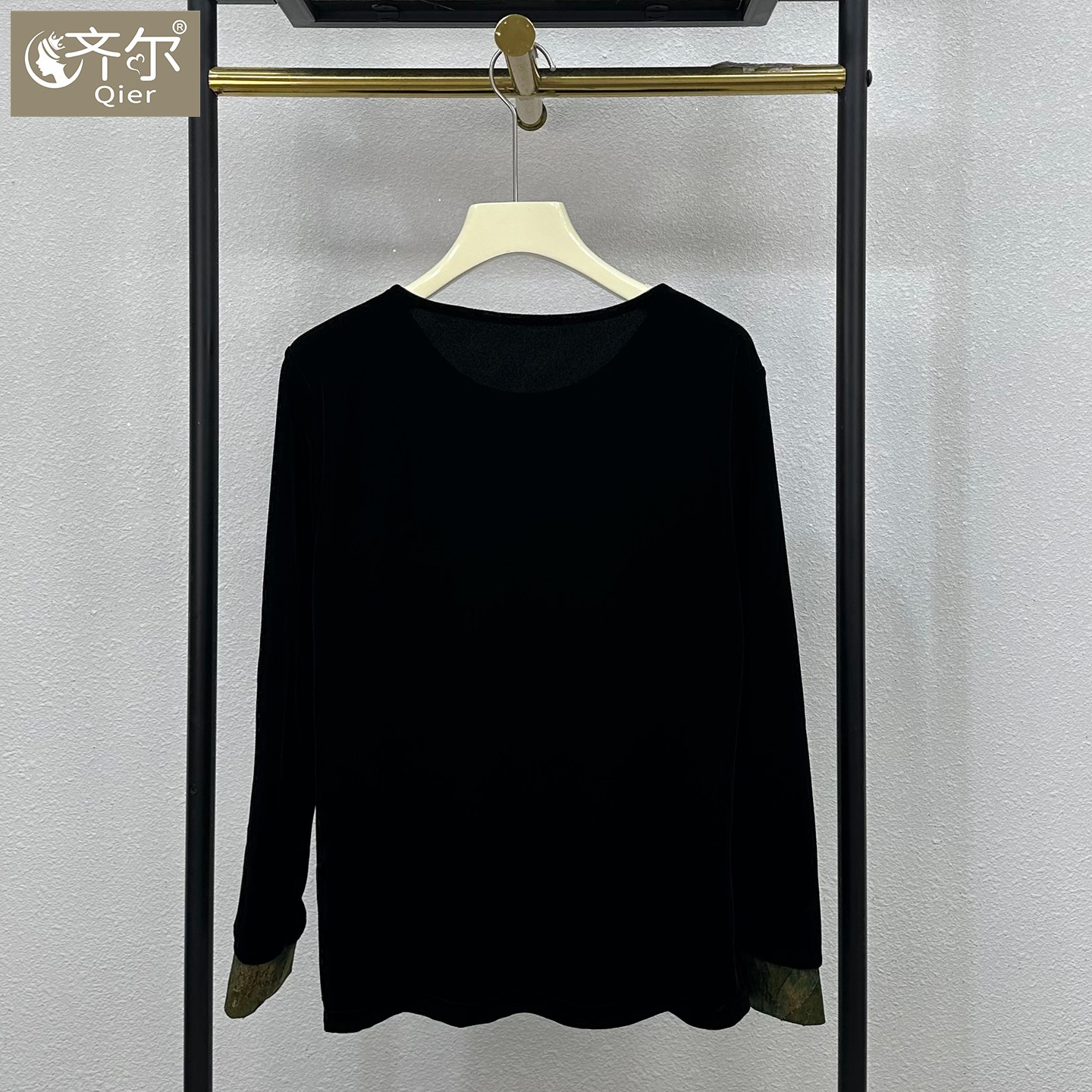 秋季新款女拼接手袖百搭真丝绒T恤内搭长袖打底衫上衣大码妈妈装