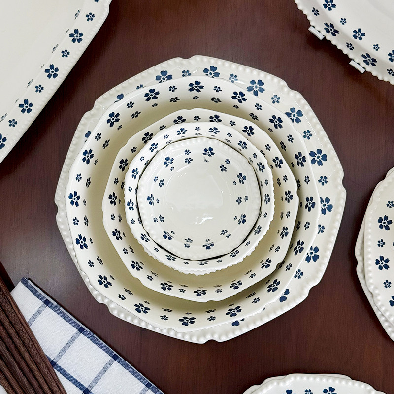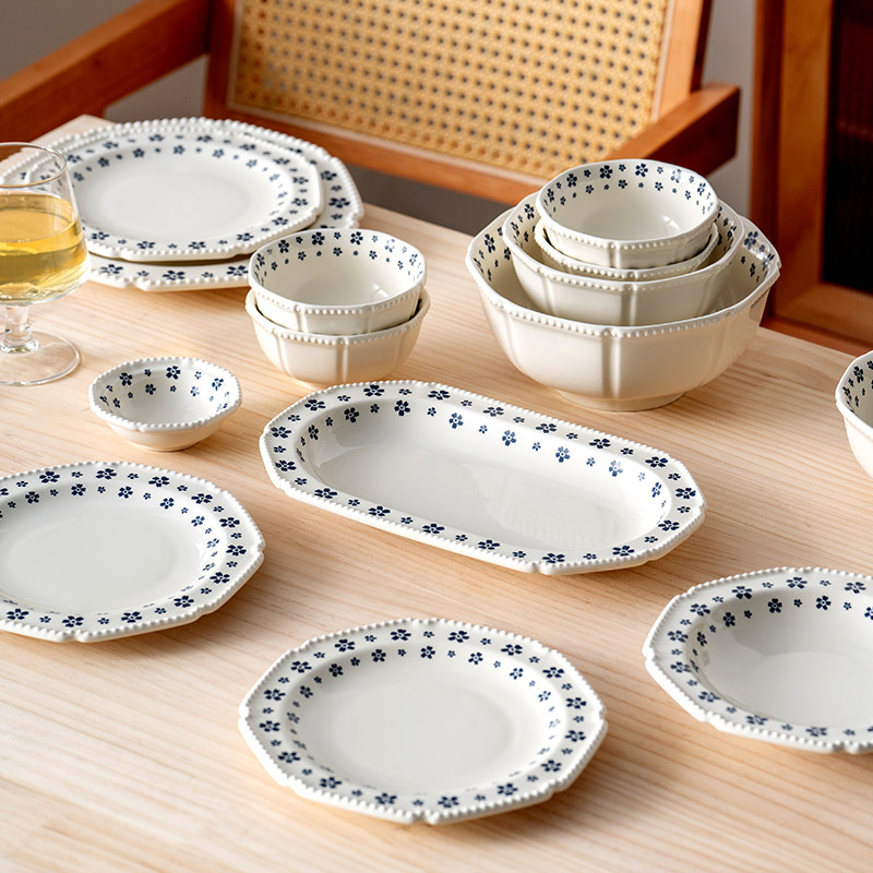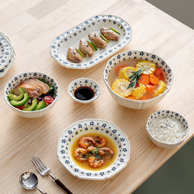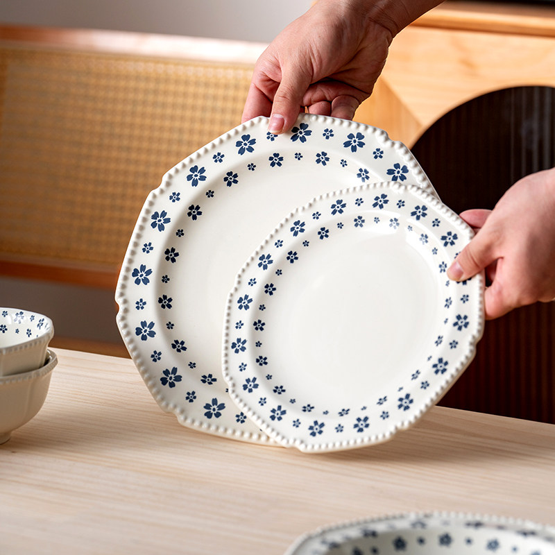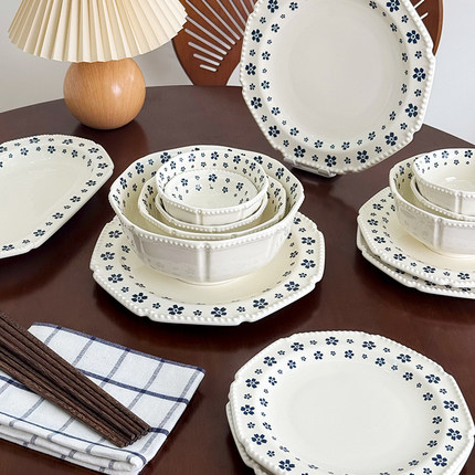 onlycook小清新蓝花陶瓷碗盘套装复古碗碟小碗浅盘子汤碗饭碗餐具