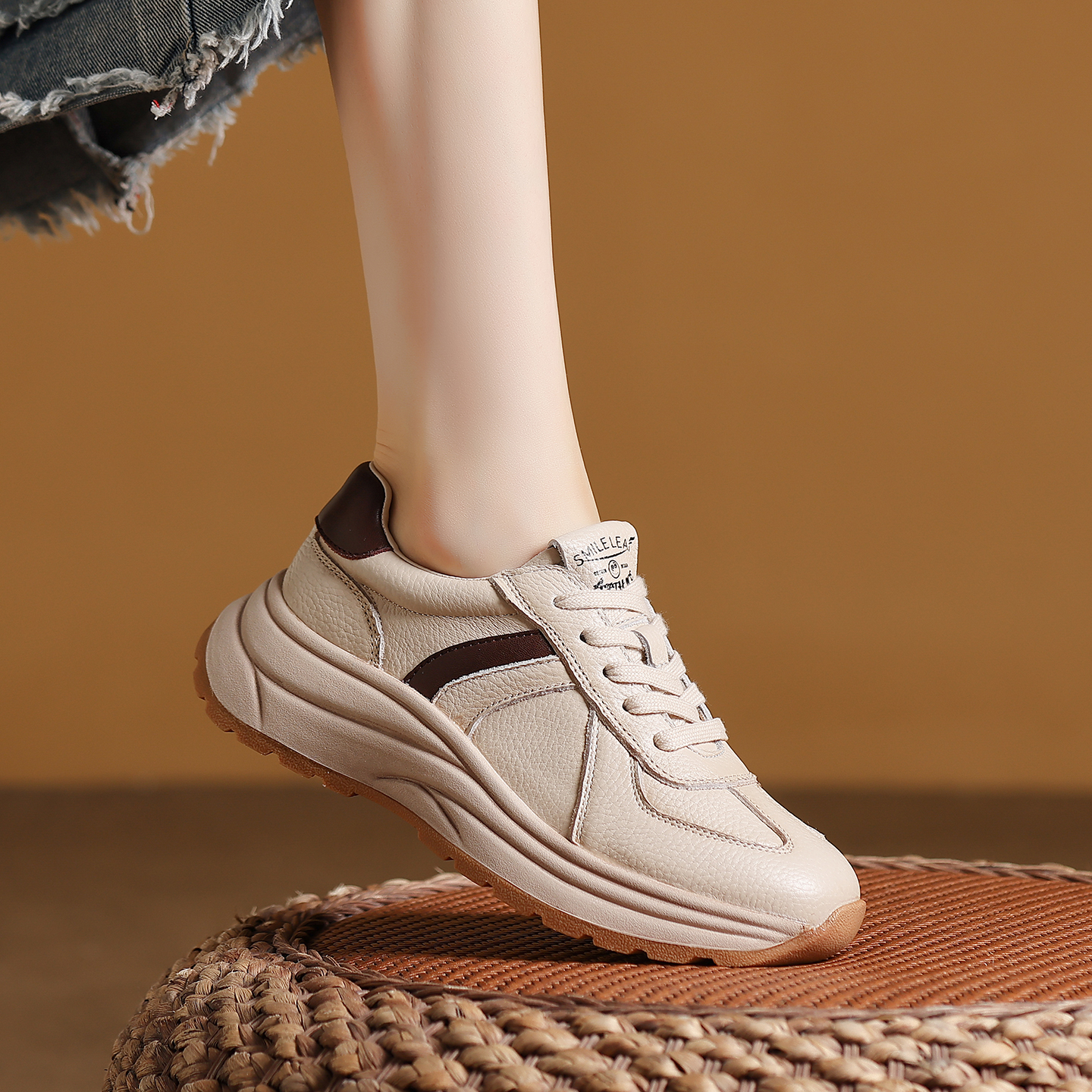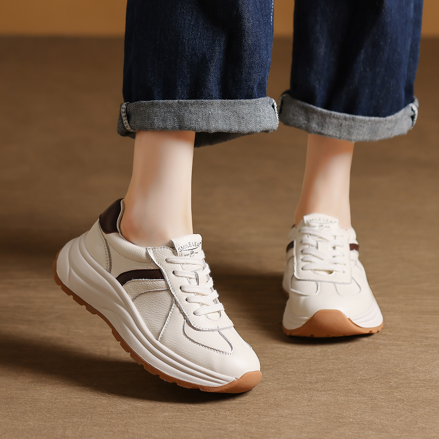 头层牛皮厚底小白鞋女软底