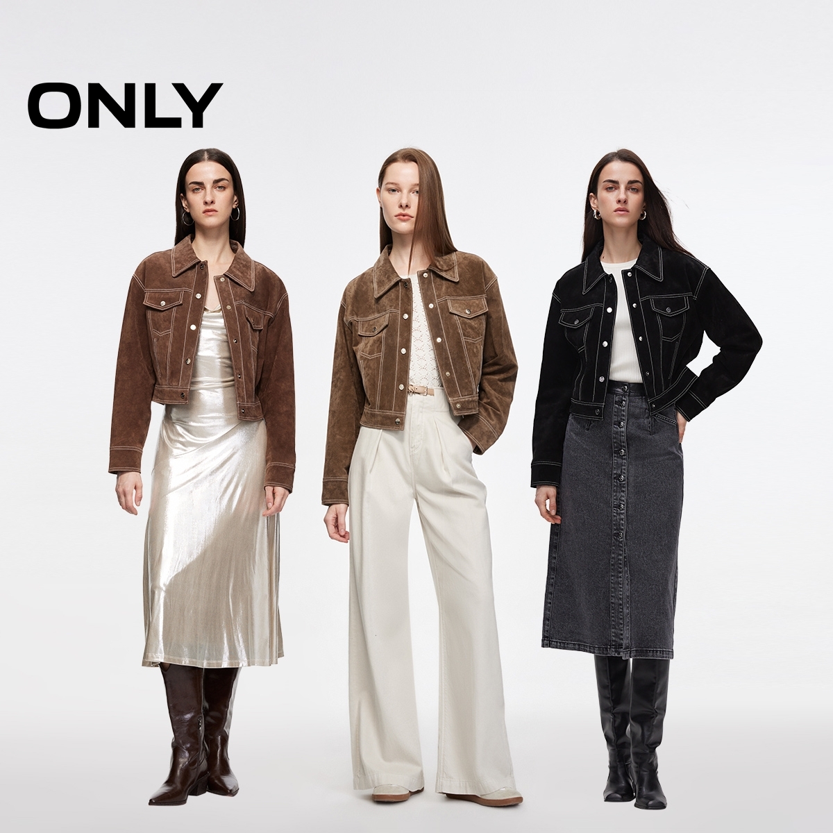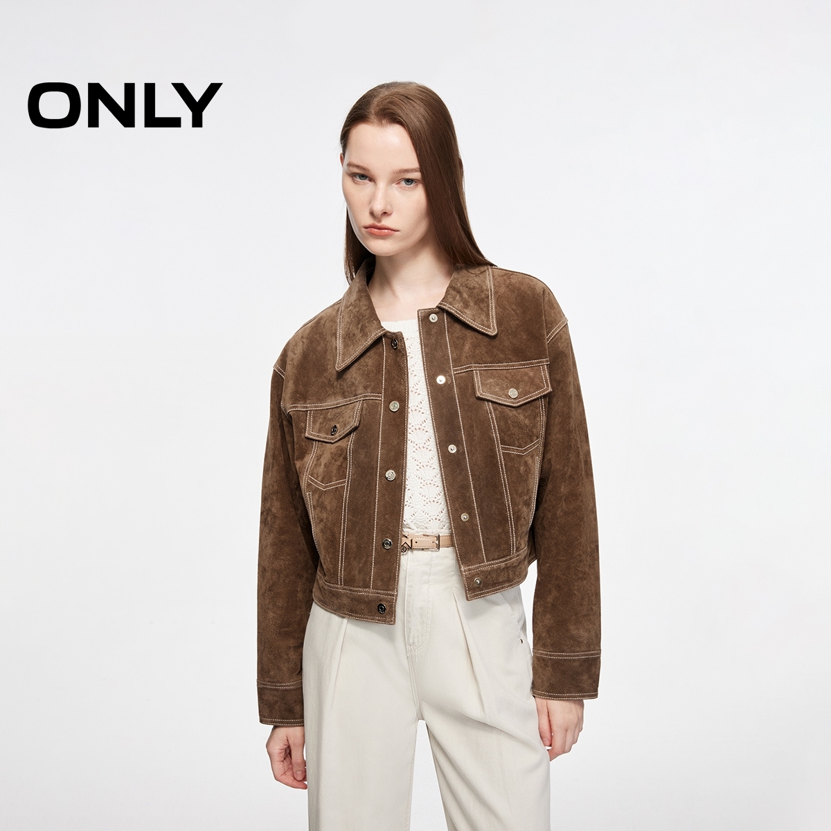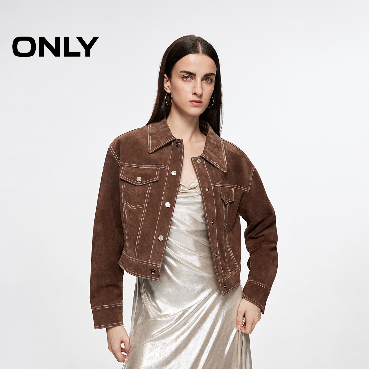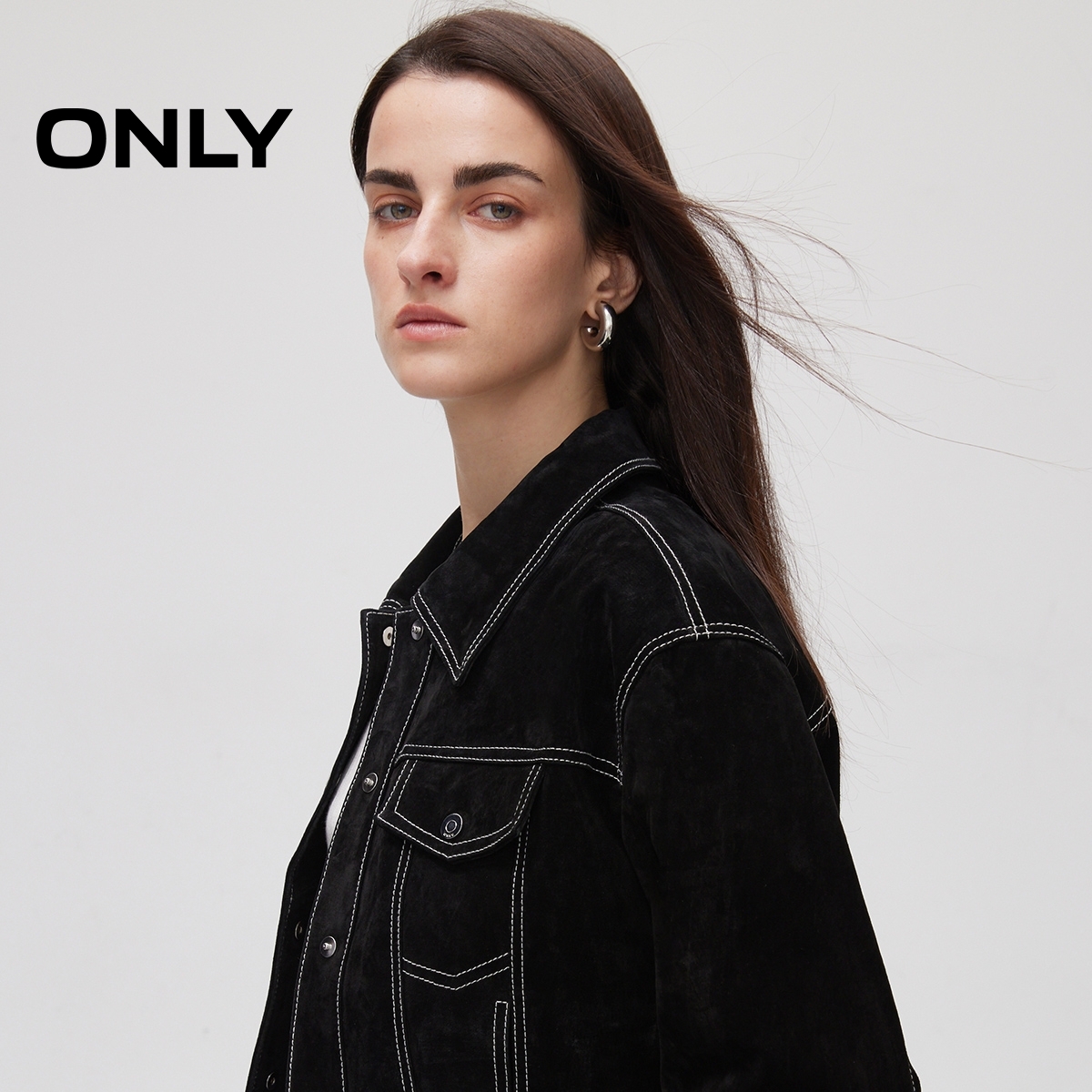 【ONLY奥莱】秋季时尚减龄撞色翻领宽松短款皮衣外套女