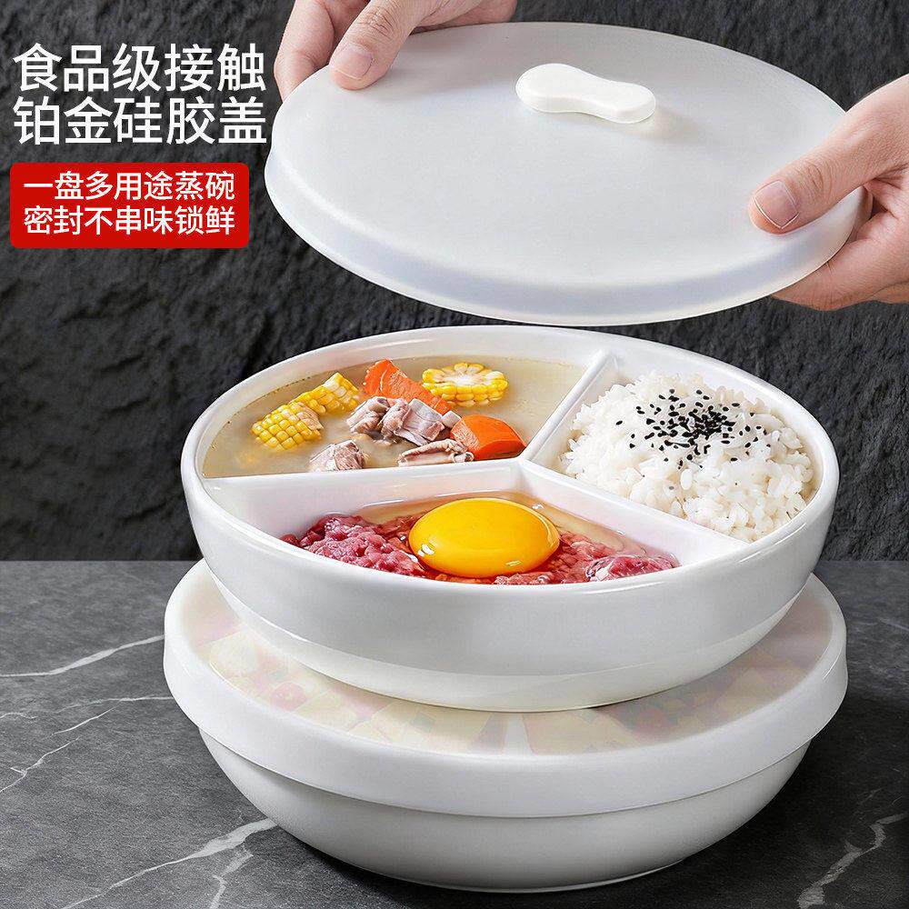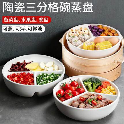 分隔蒸盘陶瓷三分格蒸盘三格陶瓷蒸碗一锅三蒸蒸蛋碗家用蒸笼蒸格