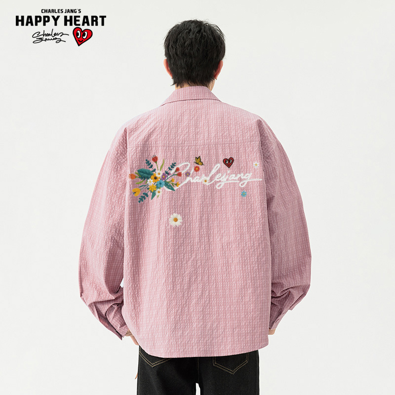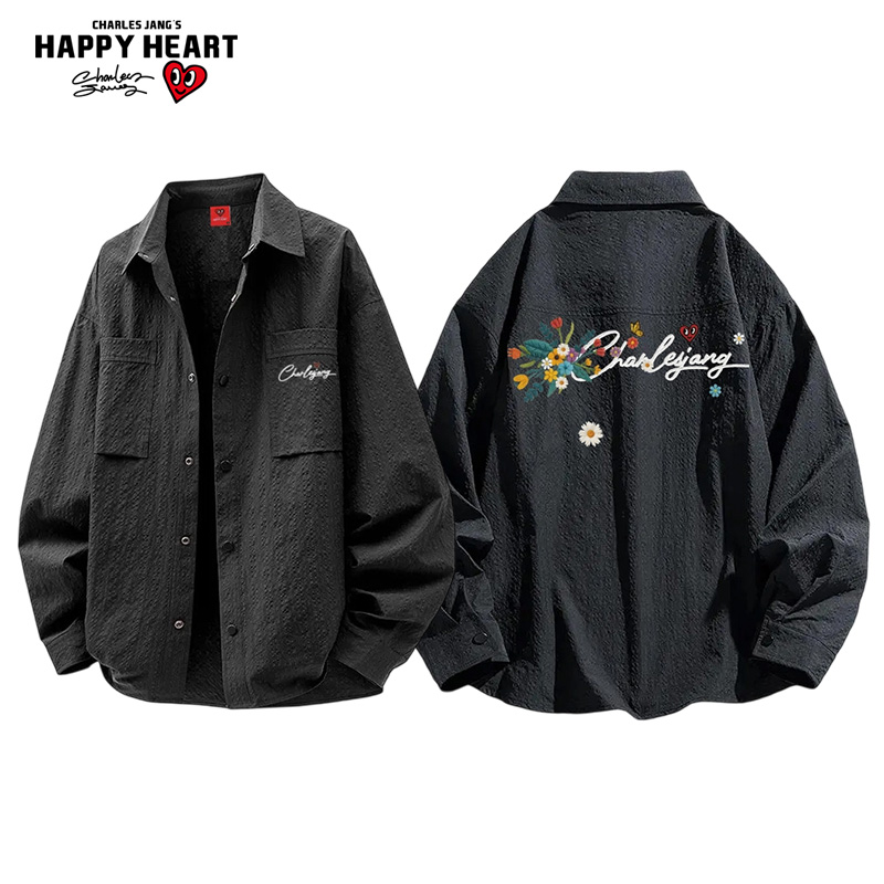 查尔斯桃心 美式手绘花卉印花夹克男春秋季新款百搭翻领衬衫外套