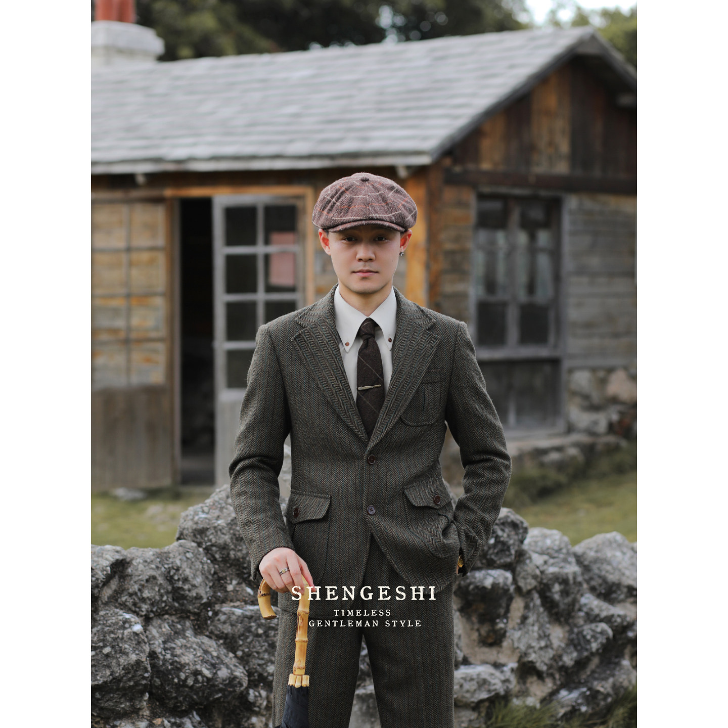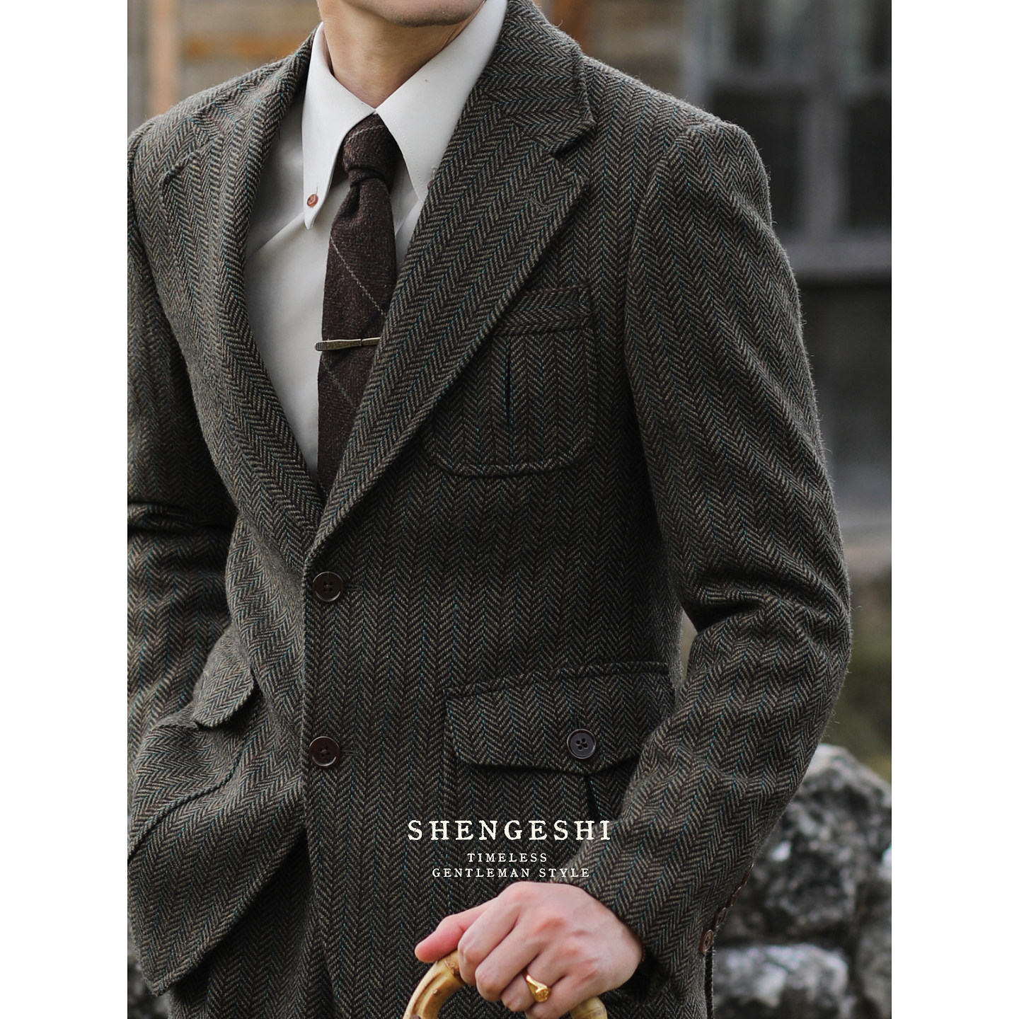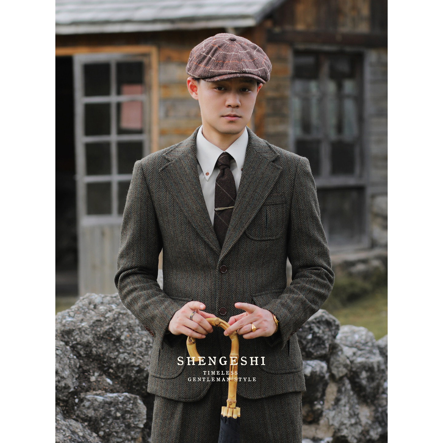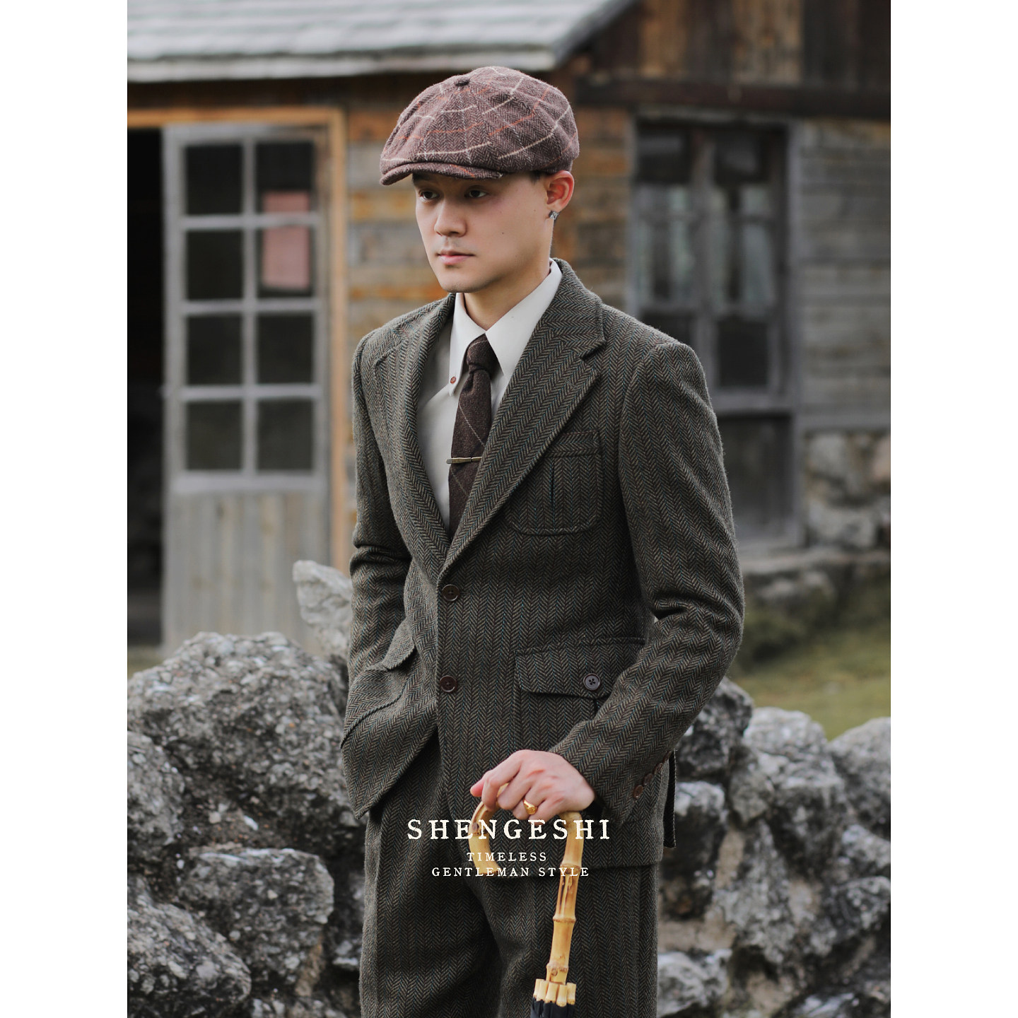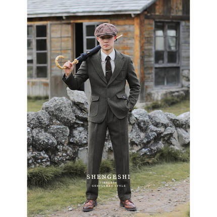 英伦复古羊毛粗花呢猎装西装雅痞绅士人字纹毛呢修身西服两件套装