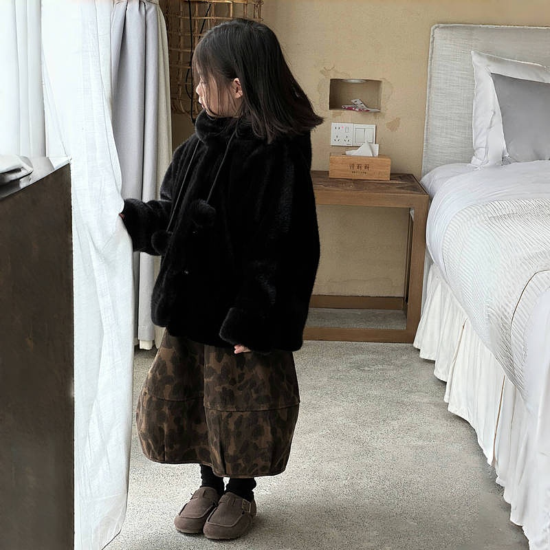 韩版儿童复古豹纹加绒半身裙2024冬装女童加厚花苞裙冬季保暖裙子