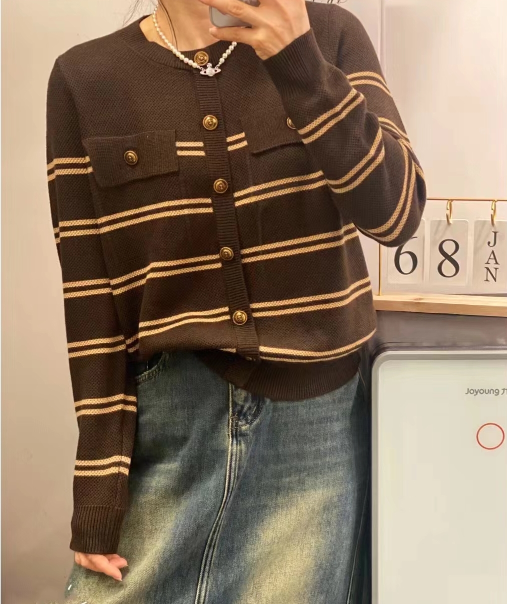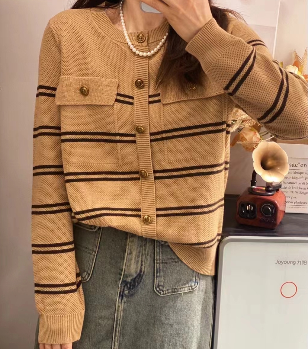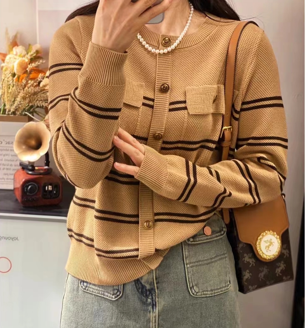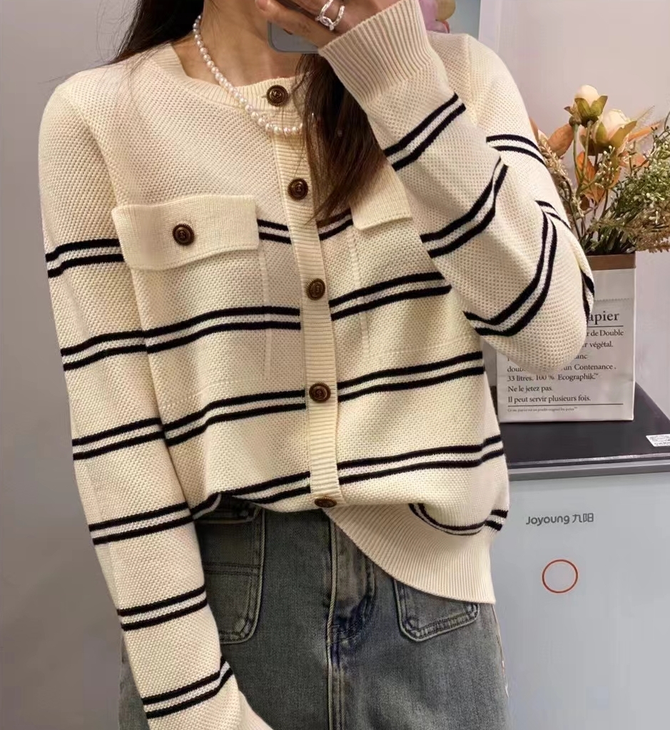 圣仕莲5866 显瘦小香风羊毛衫条纹针织衫女宽松圆领上衣套头毛衣T
