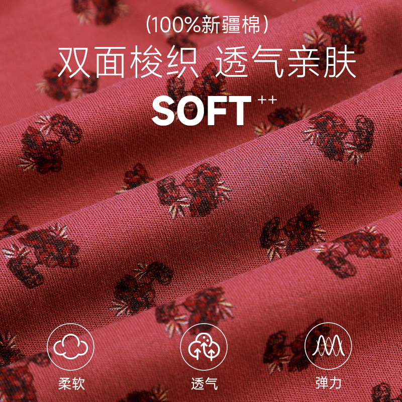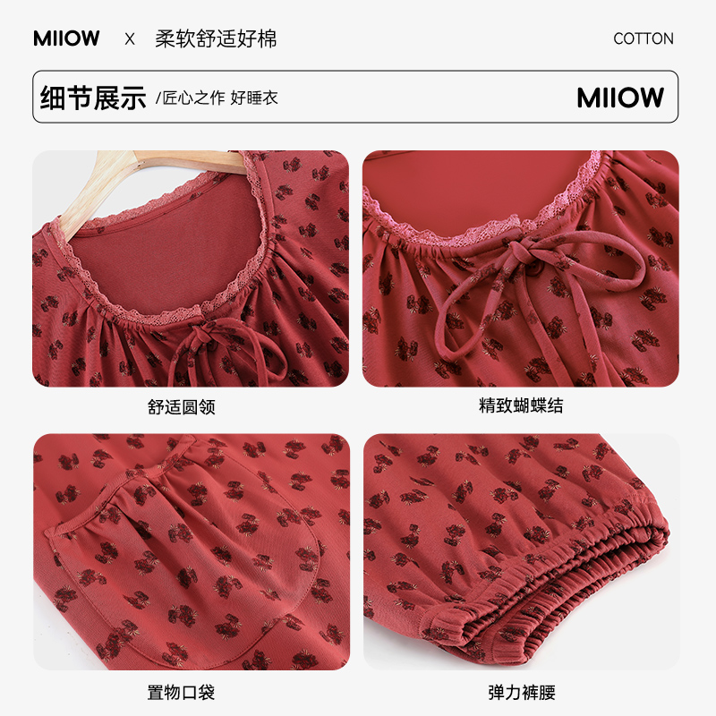 猫人纯棉睡衣女秋冬新款宽松大码中老年妈妈红色家居服可外穿套装