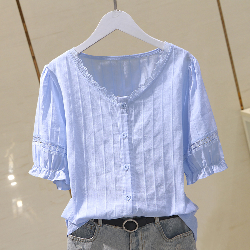 复古V领短袖棉布上衣2025夏季新款气质蕾丝拼接宽松百搭小衫衬衫