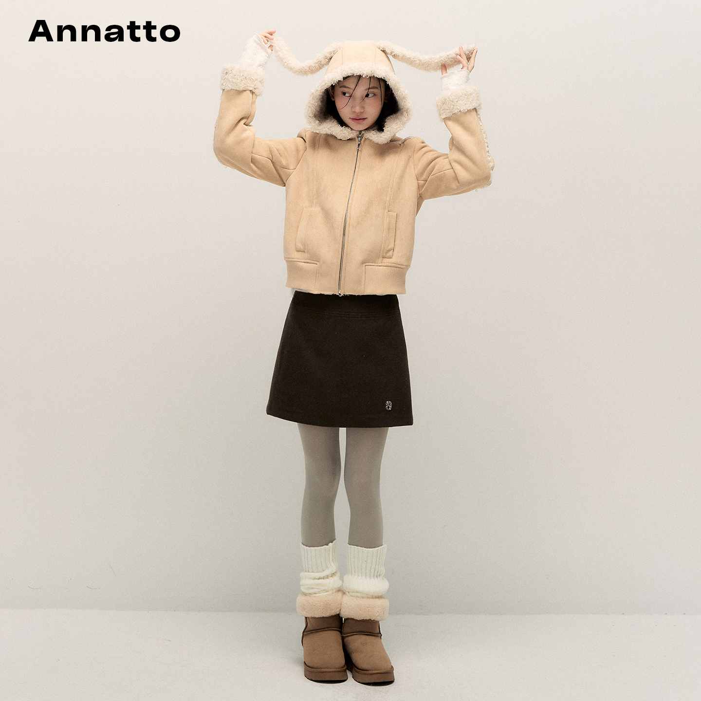 ANNATTO 原创设计冬季卡其色小兔子耳朵修身皮毛一体连帽短外套女