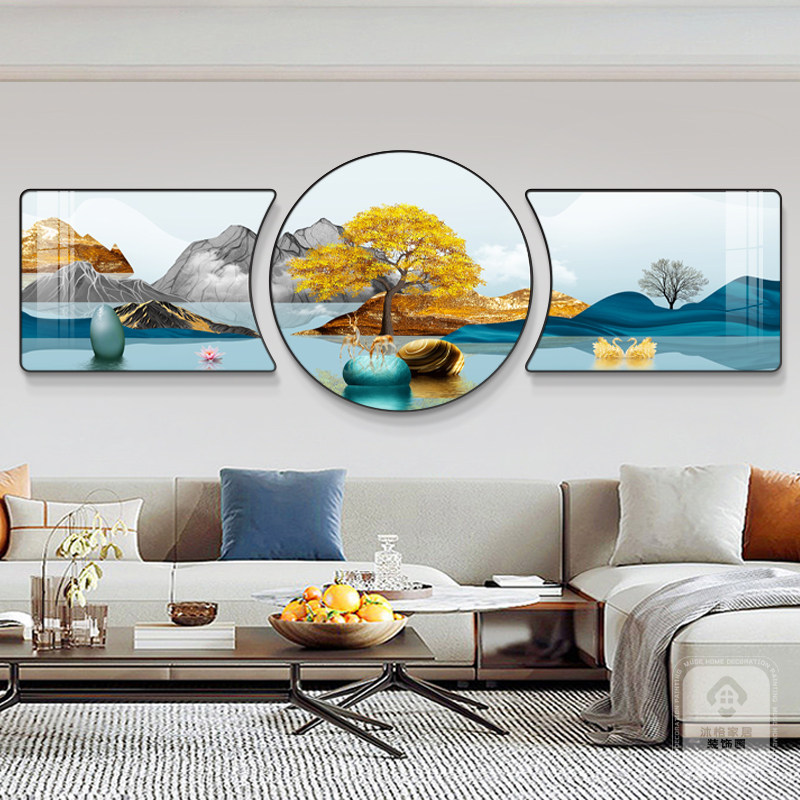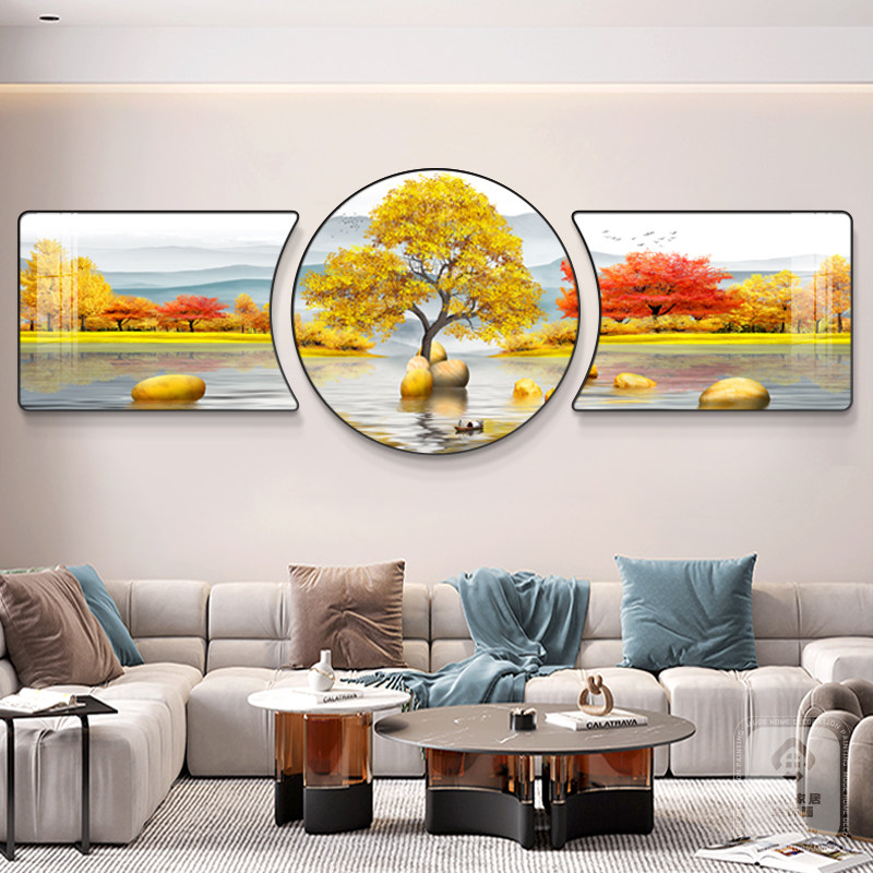 背靠金山客厅装饰画福禄麋鹿发财树沙发背景墙山水风景壁画三联画