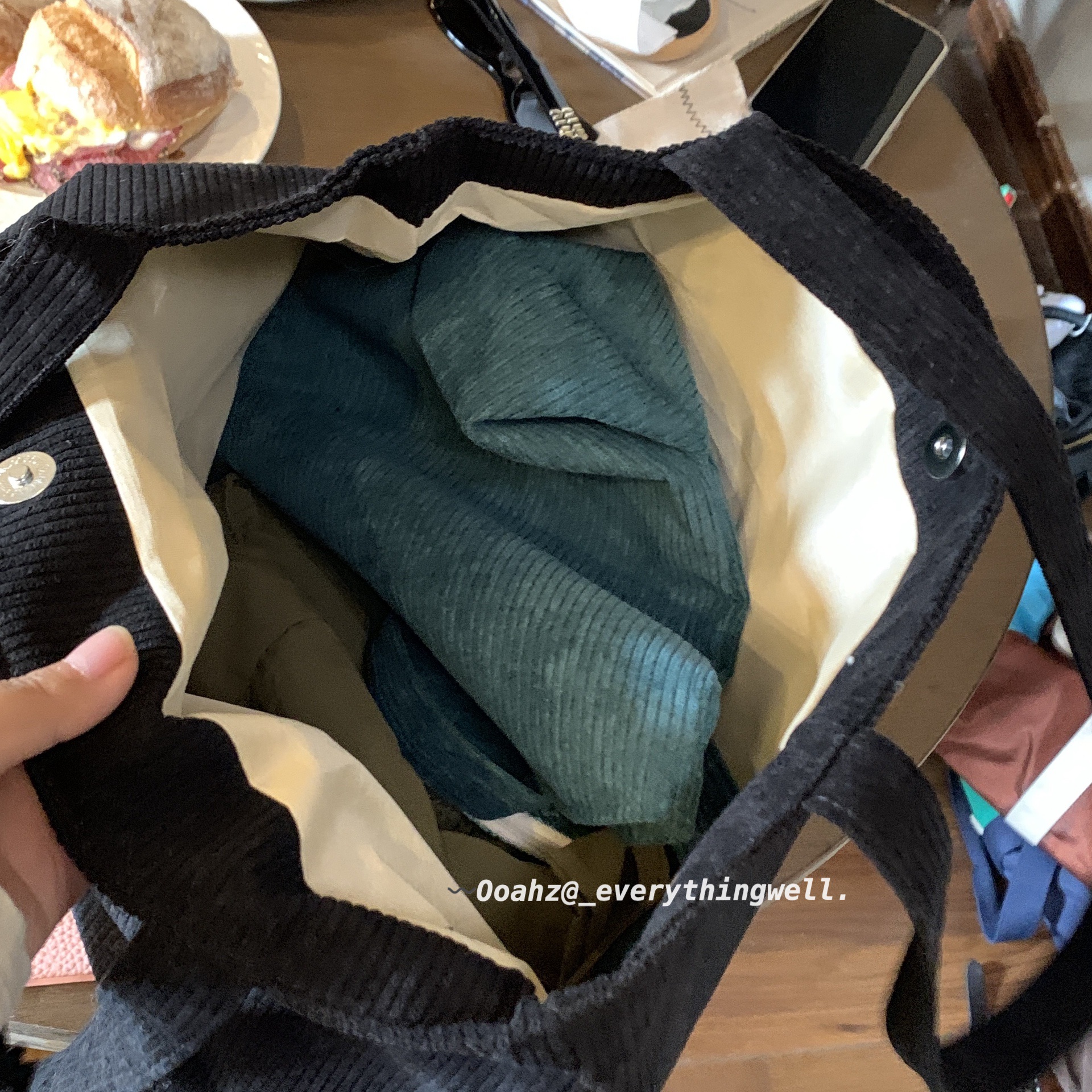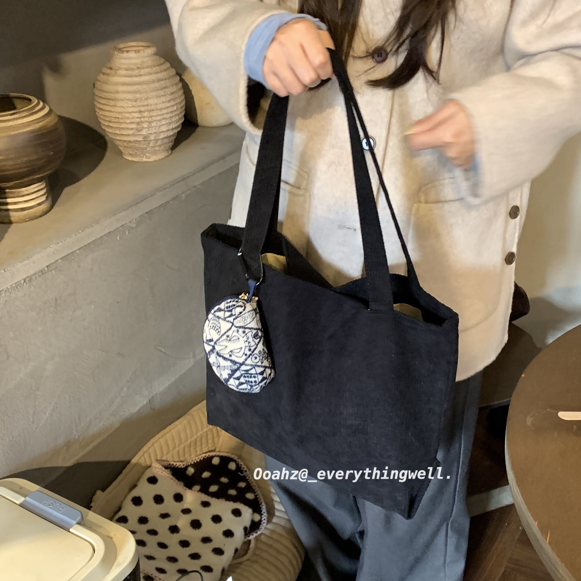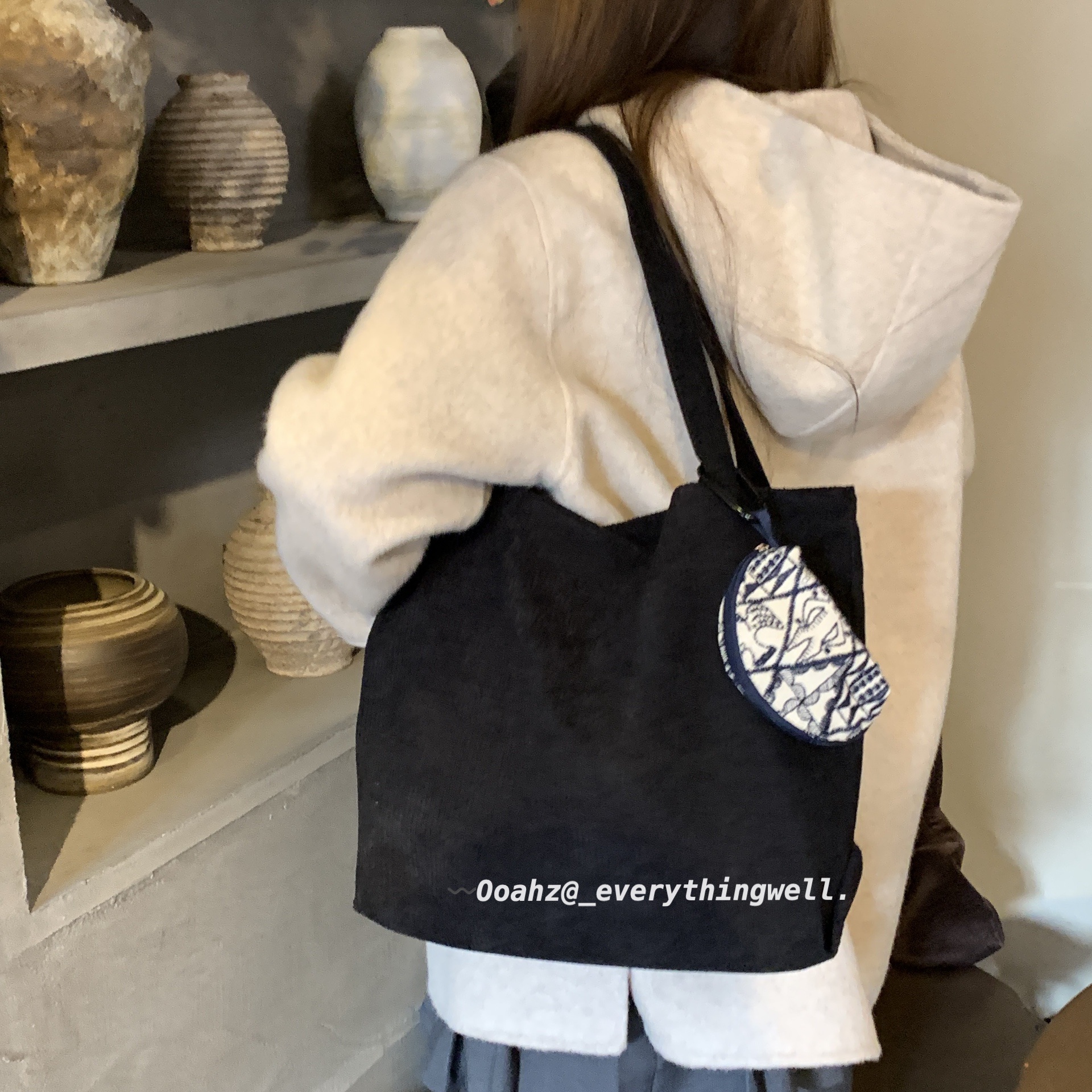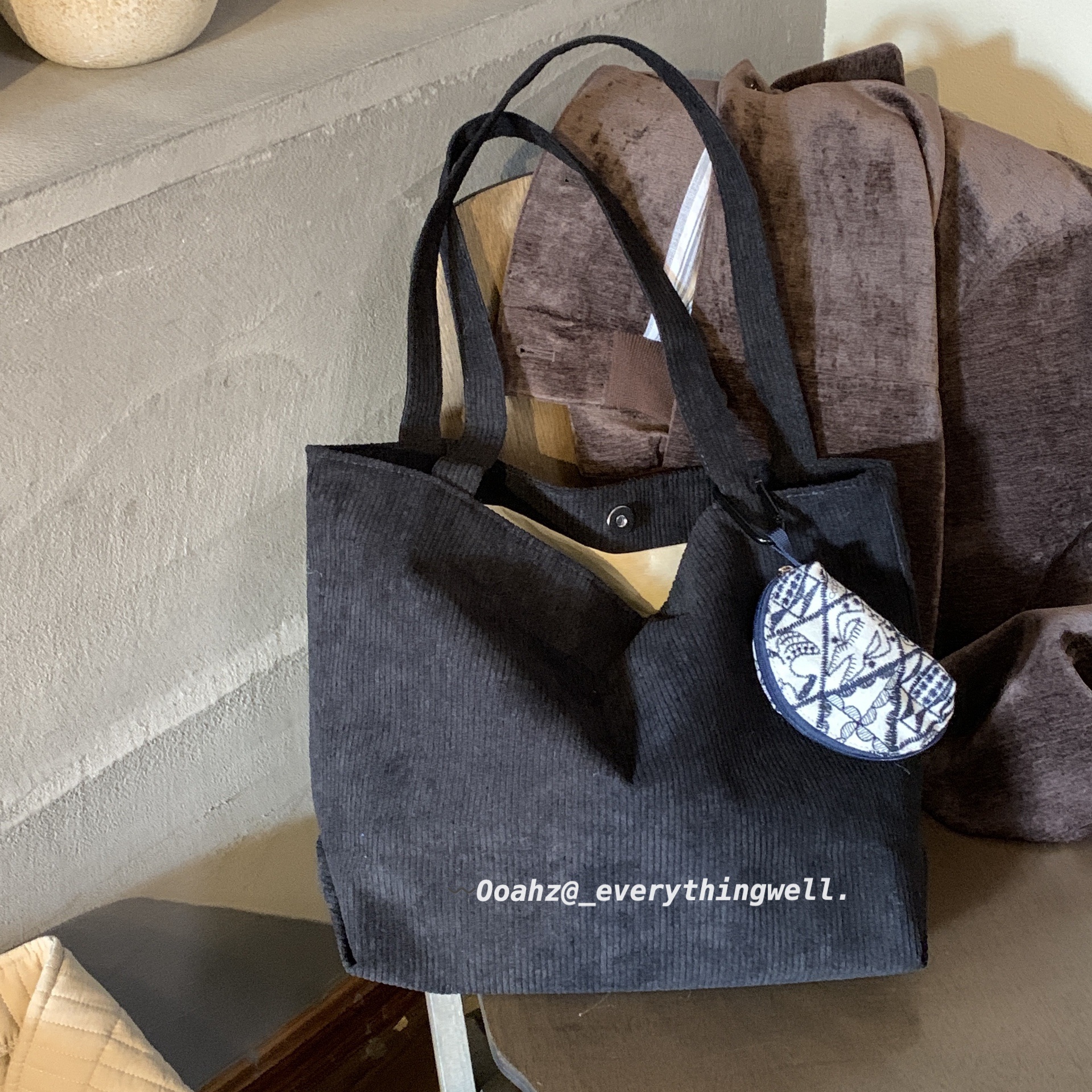 "单曲循环"韩版灯芯绒单肩托特包 复古大容量购物袋ins休闲手提包