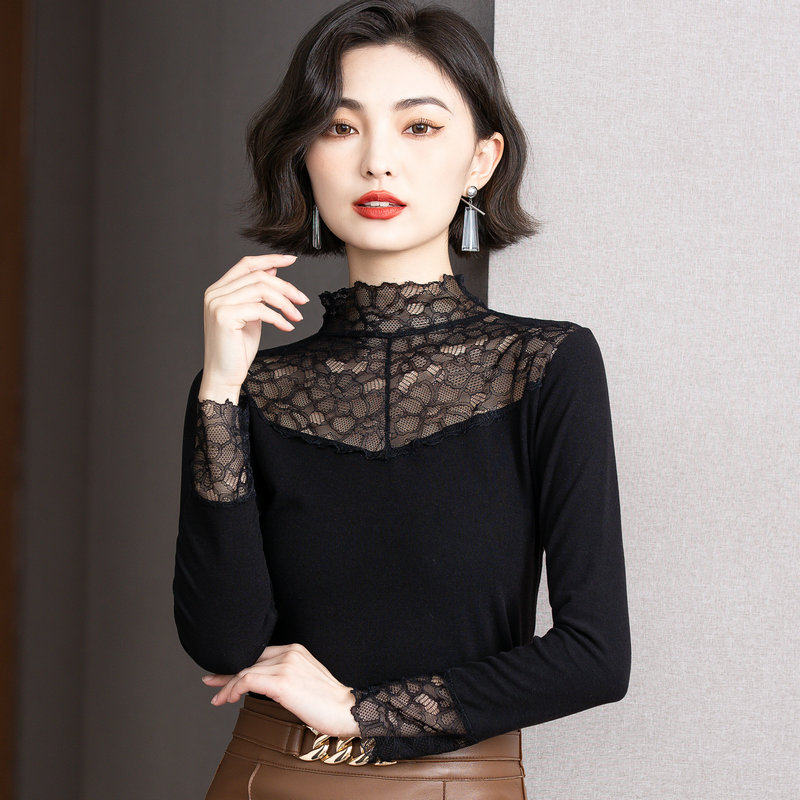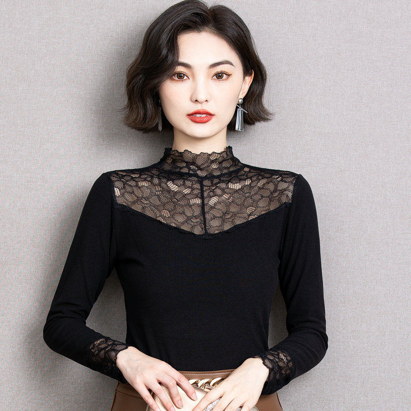 特价蕾丝磨毛半高领打底衫女秋弹力内搭长袖t恤修身显瘦上衣小衫