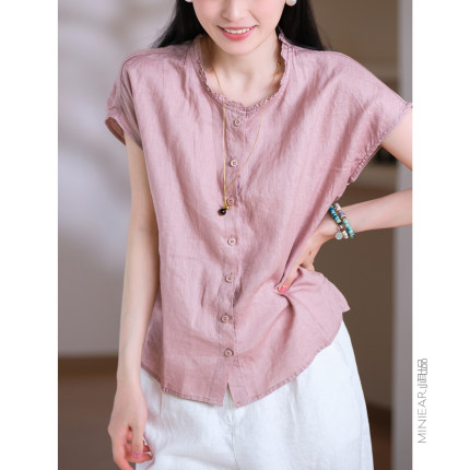 小耳出品柔软亲肤100%亚麻文艺气质木耳边领口单排扣短袖衬衫上衣