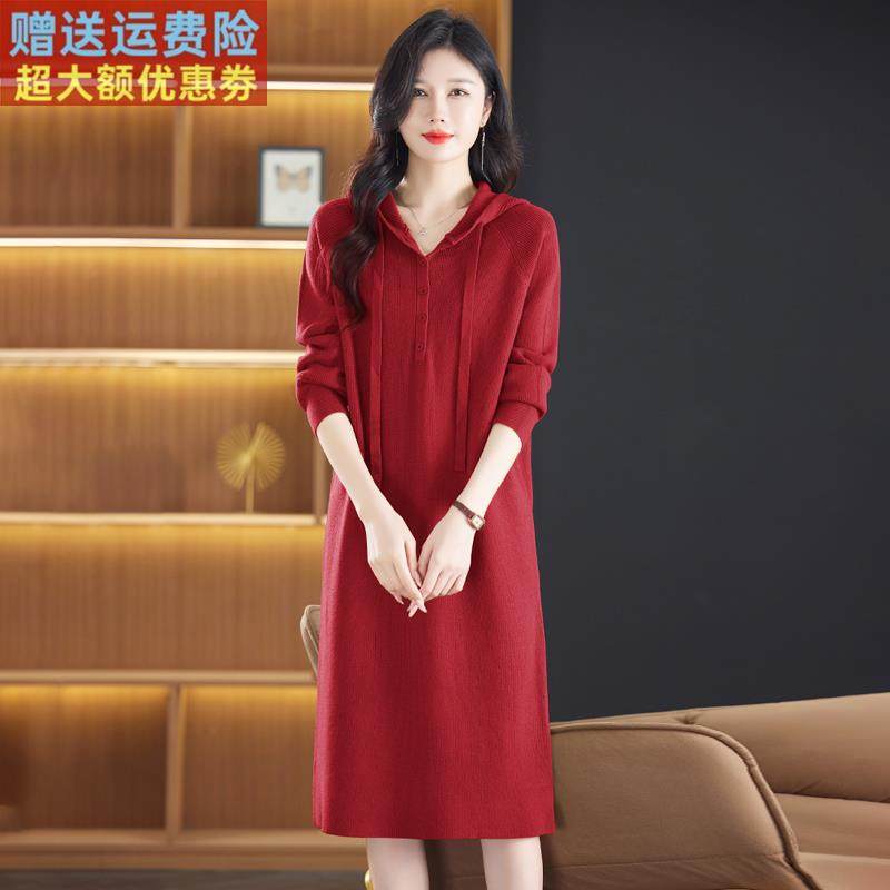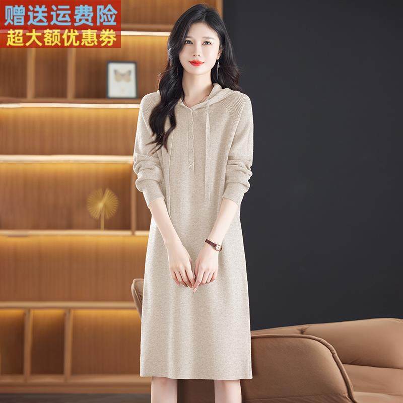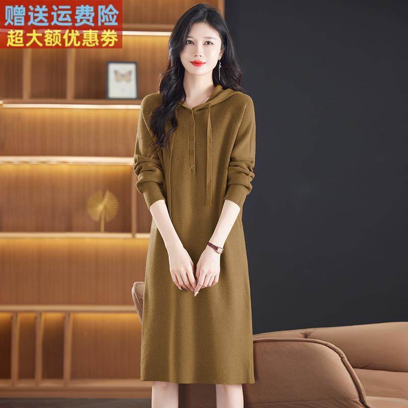 连帽抽绳针织连衣裙女2025秋冬新款过膝长款毛衣裙慵懒风卫衣裙子