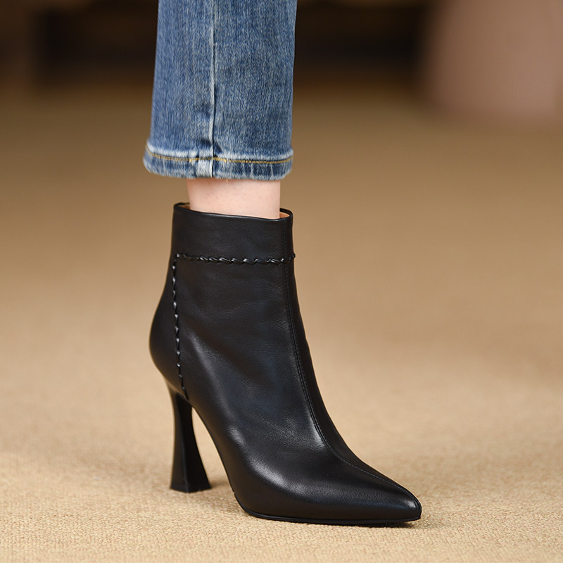 misili 时尚尖头粗跟短靴冬季新款9.5cm黑色高跟鞋真皮平底女靴子