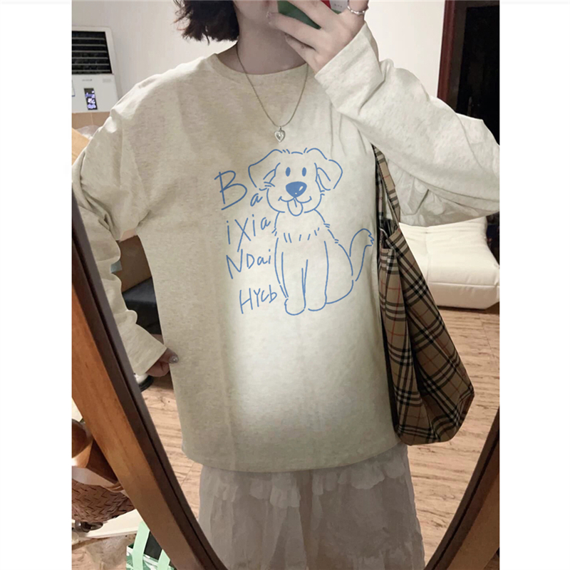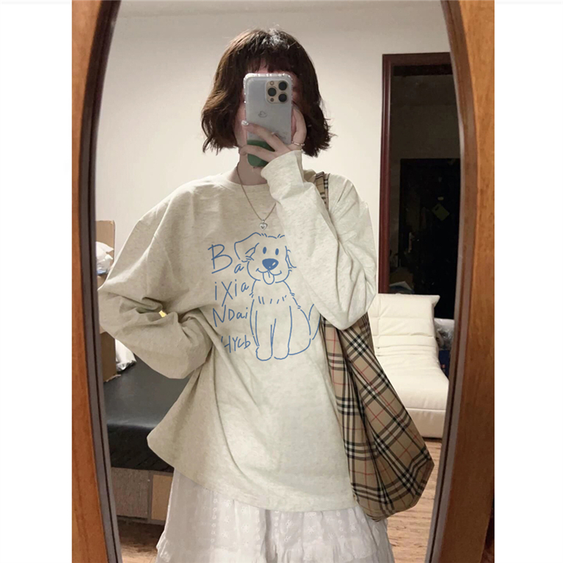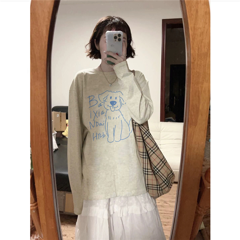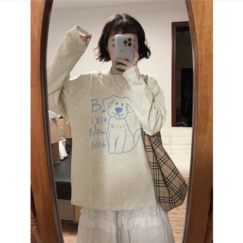 100%纯棉美式潮牌手绘小狗正肩长袖t恤女2025新款早秋小众体恤衫