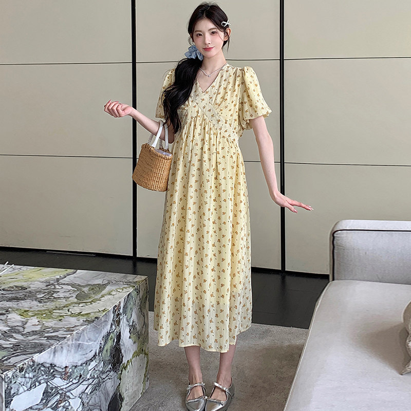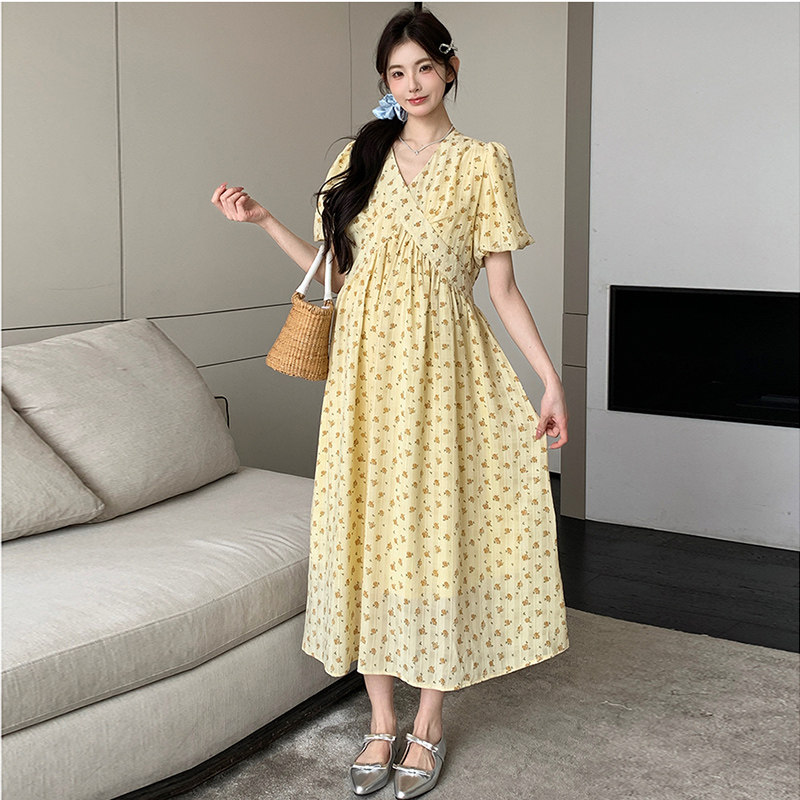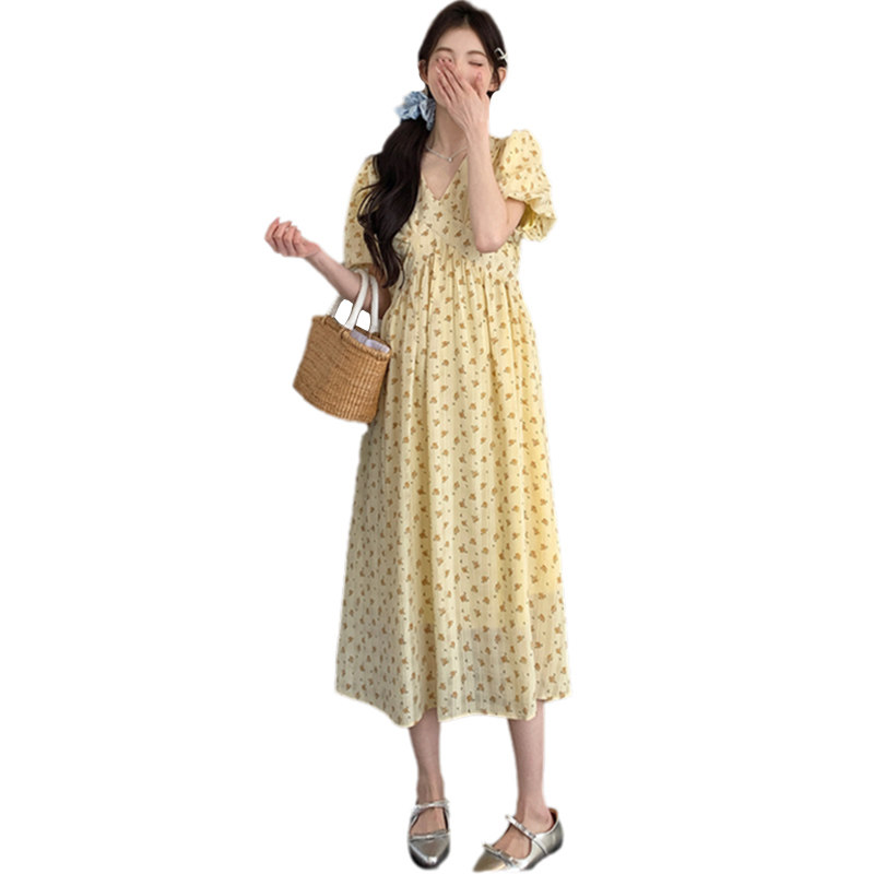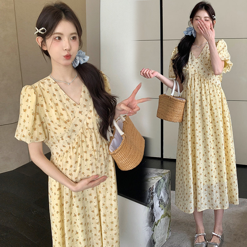 孕妇装夏天裙子中长款时尚过膝碎花显瘦长裙夏季薄款雪纺连衣裙女