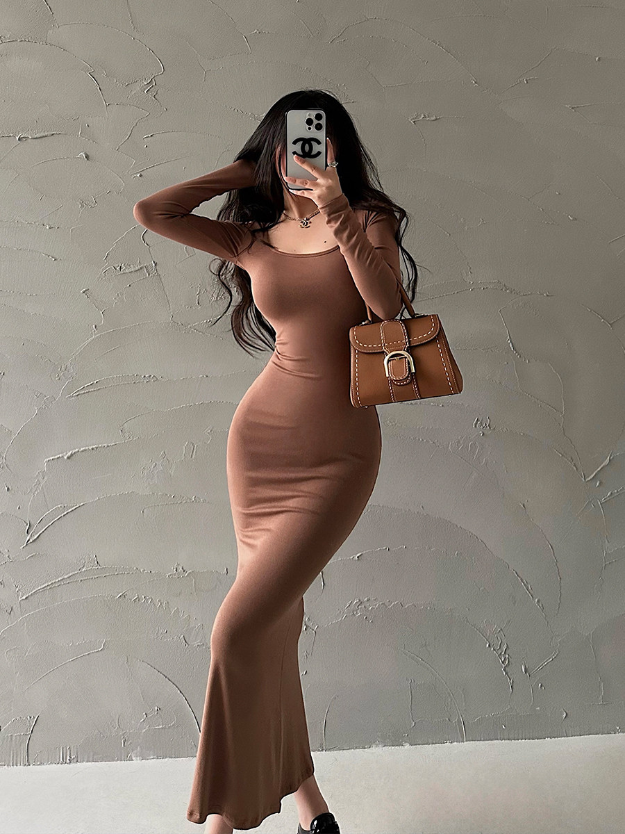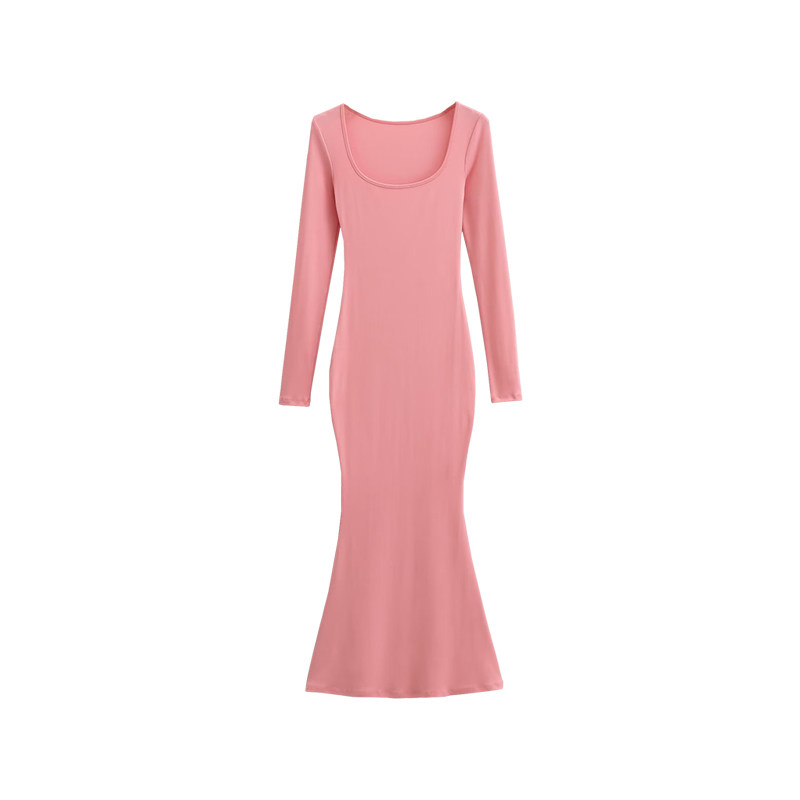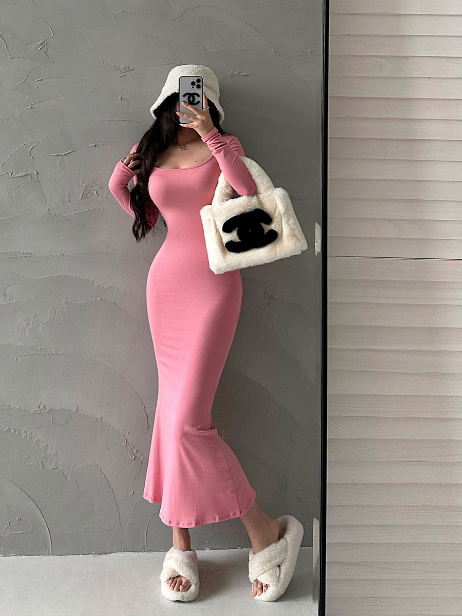 YoungGirlDay纯欲风性感U领紧身显瘦长袖打底包臀鱼尾连衣裙长裙