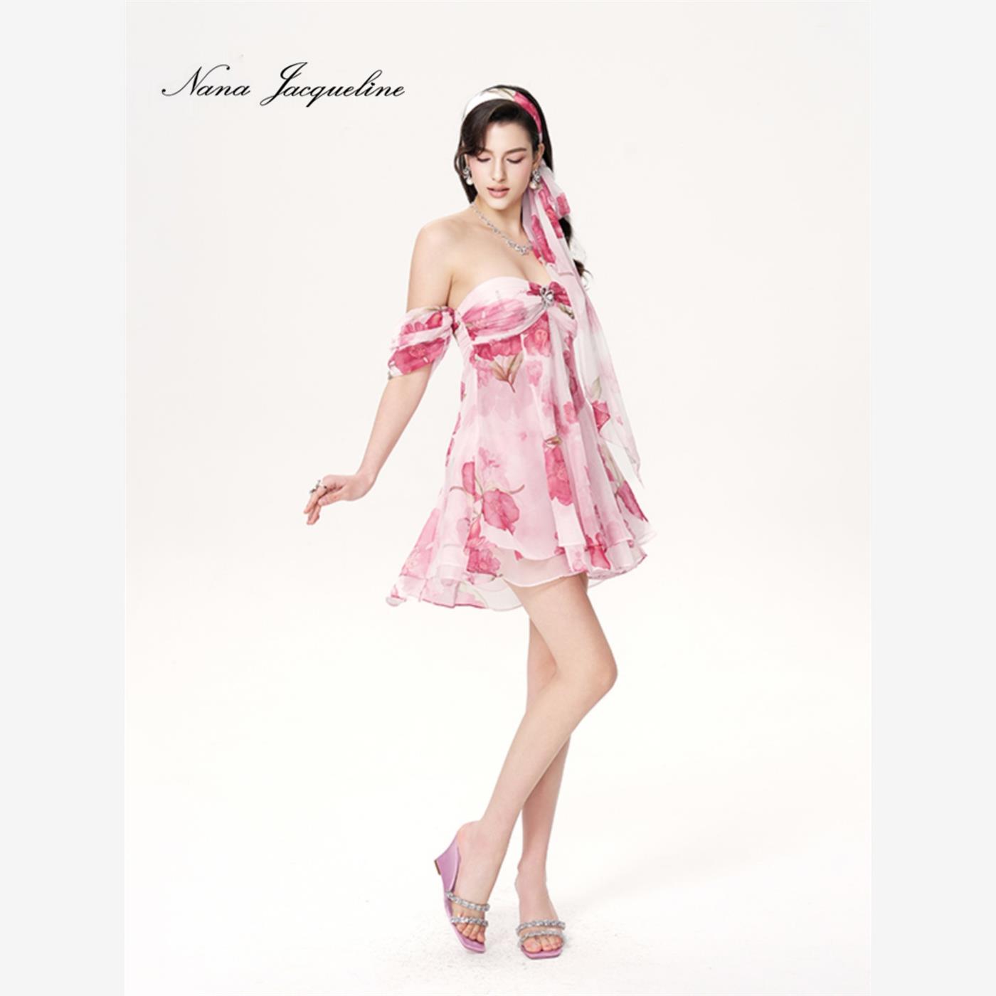 NanaJacqueline2025早秋新款一字肩印花蓬蓬连衣裙女防滑胸针装饰