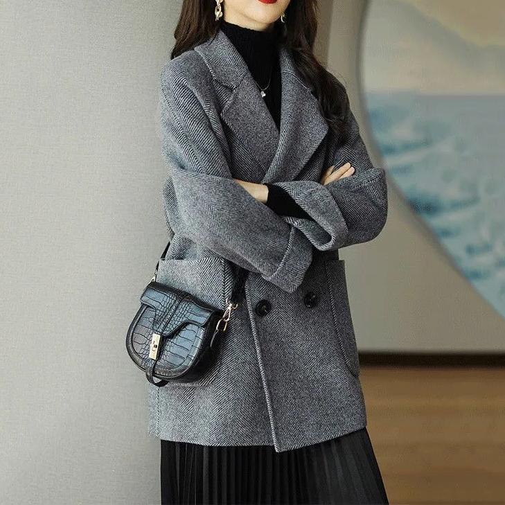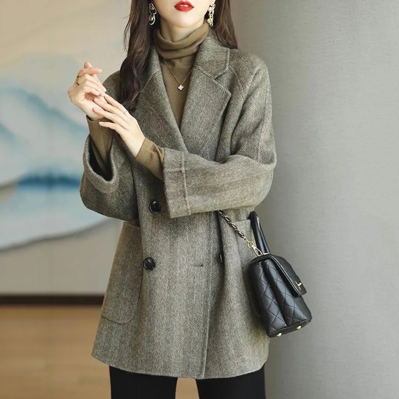 韩版毛呢外套女秋中长款小个子宽松西装领双排扣时尚高端风衣洋气