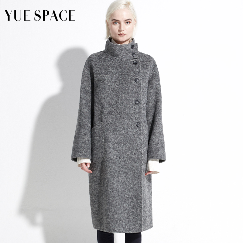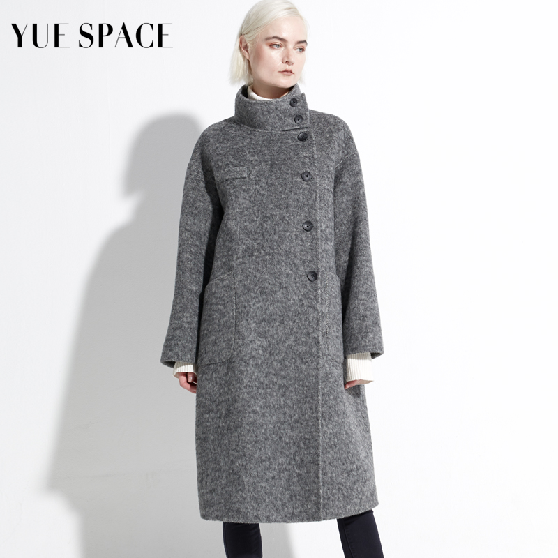 YUESPACE双面羊毛大衣女宽松直筒毛呢外套秋冬单排扣立领兔毛时尚