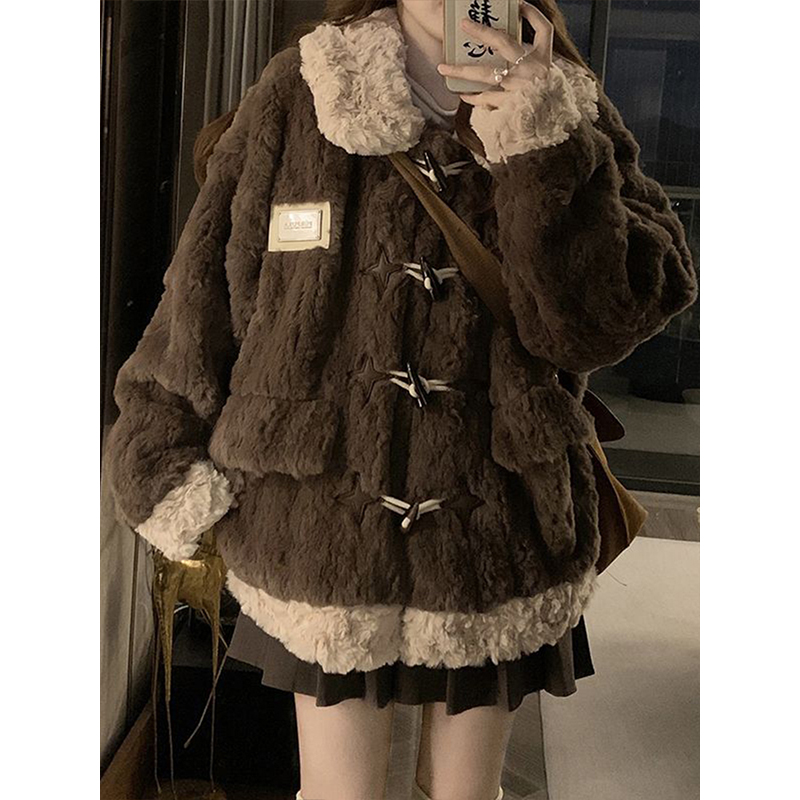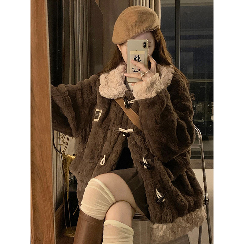 特大码女装牛角扣羊羔毛棉衣女秋冬胖mm减龄保暖棕色毛绒棉服外套