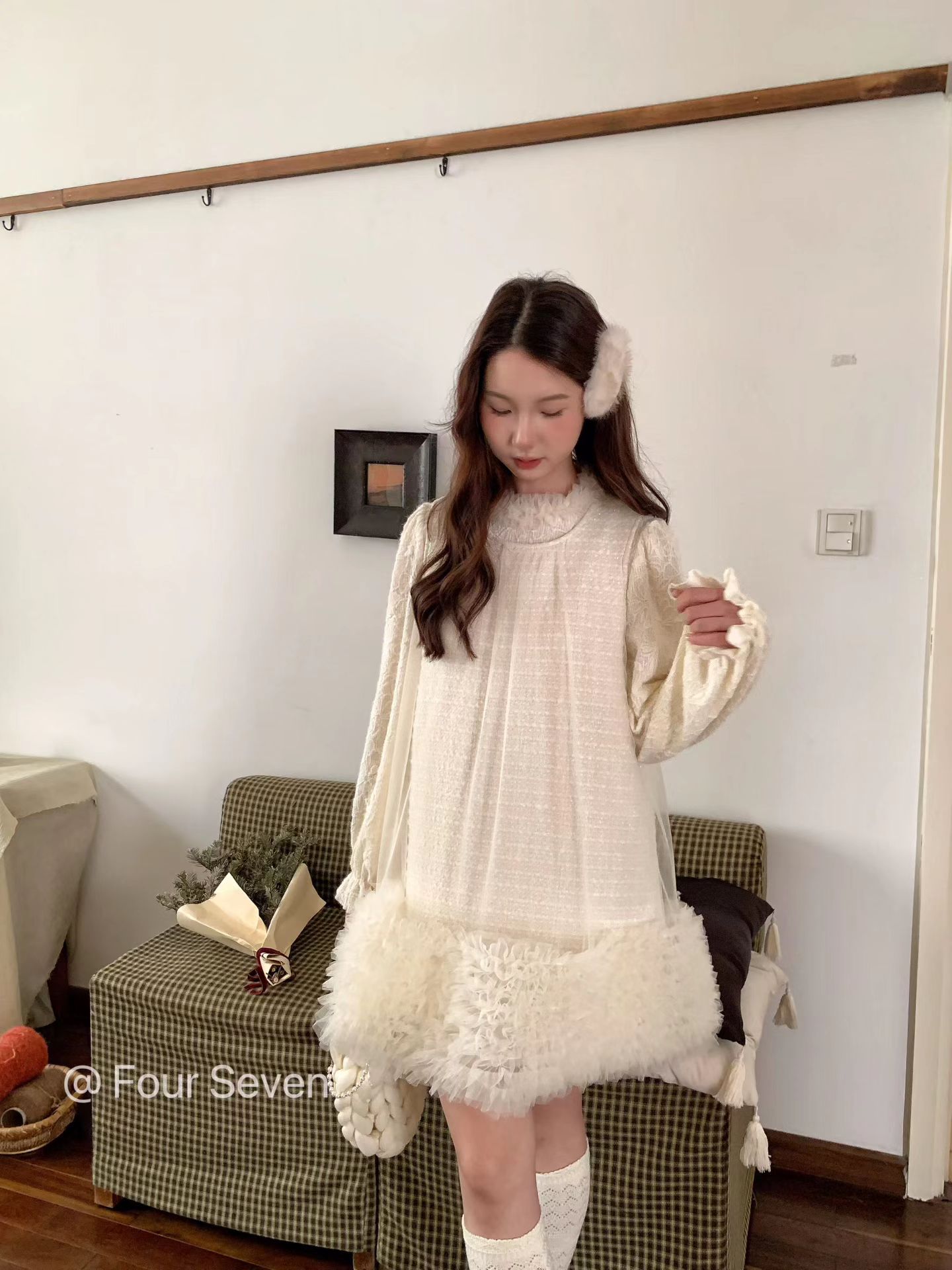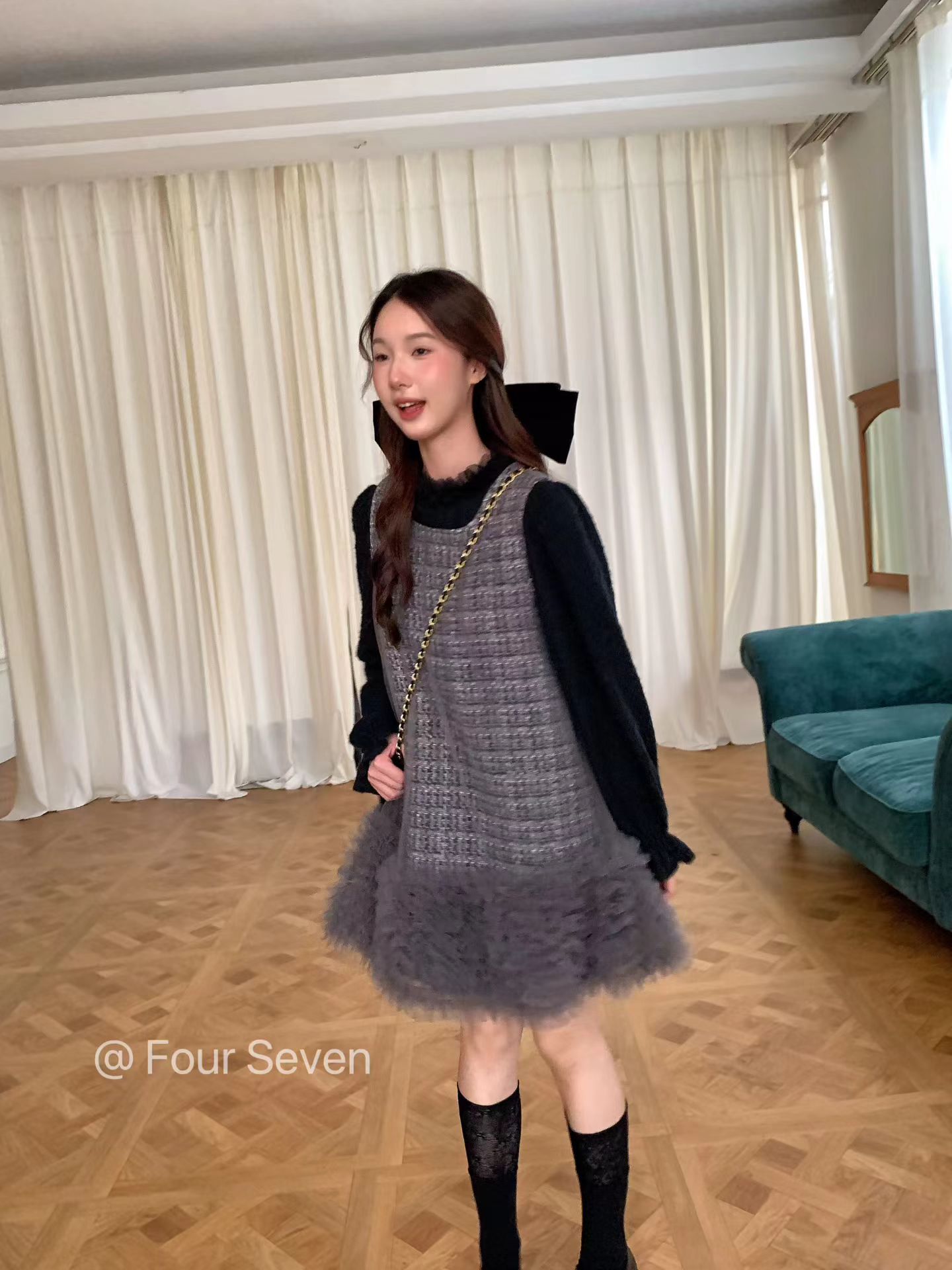 FOUR SEVEN 2025秋冬原创 韩版重工网纱拼接小香风面料A字背心裙