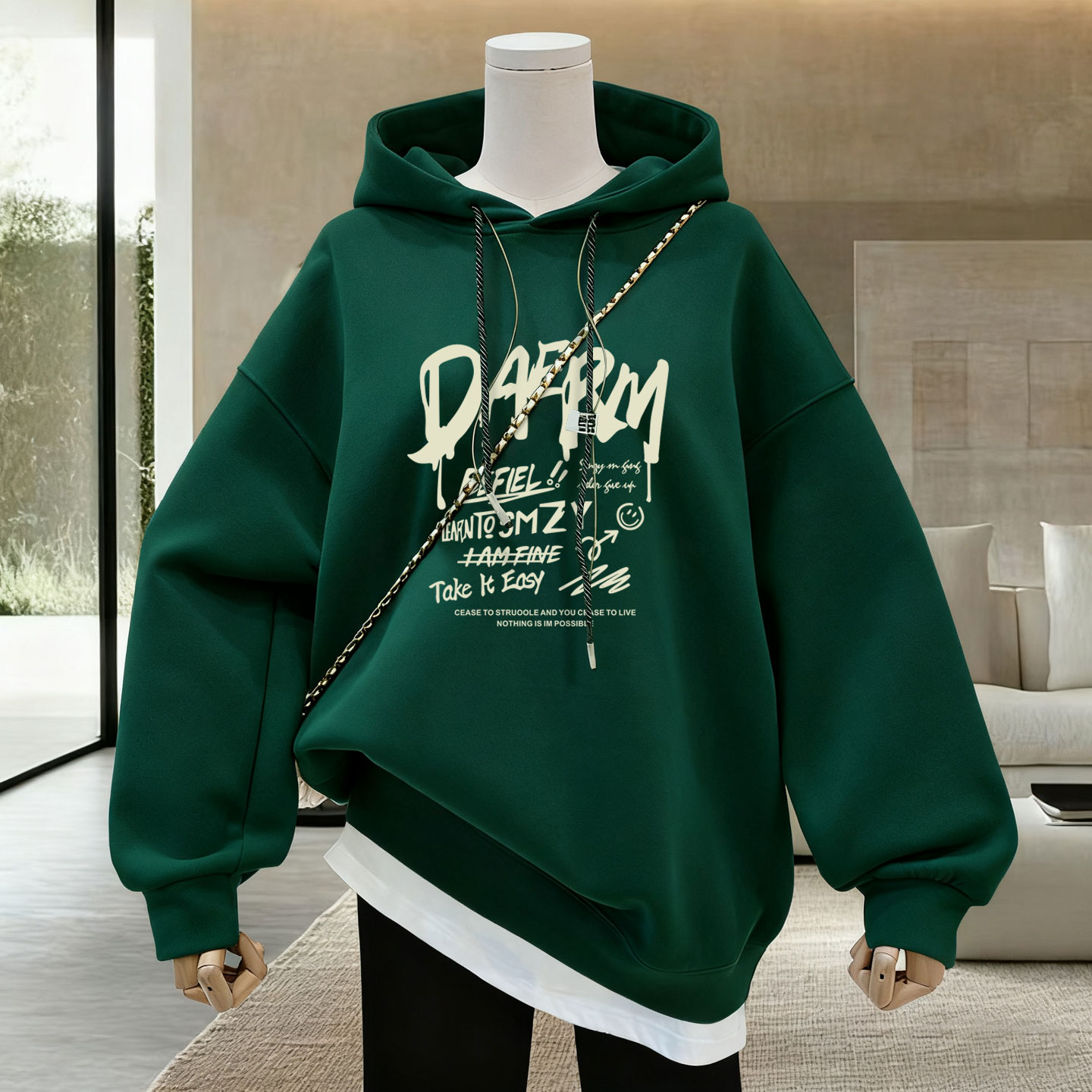 2025春秋冬季新款流行字母中长款加绒加厚宽松套头连帽卫衣女潮