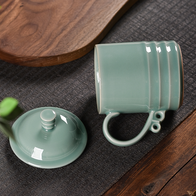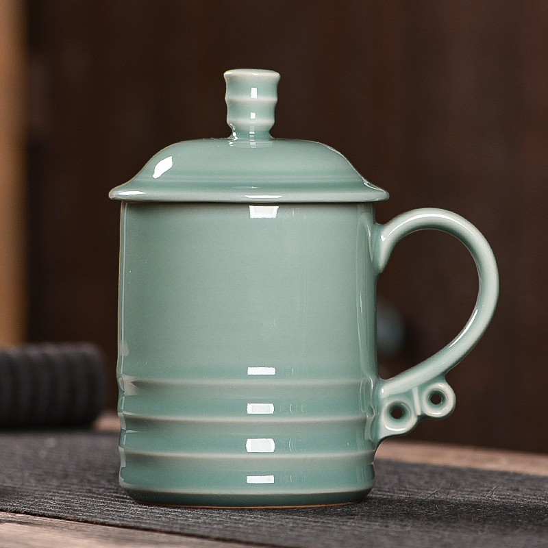 青瓷茶杯陶瓷带盖家用招待大水杯办公室杯子会议瓷杯定制刻字茶杯