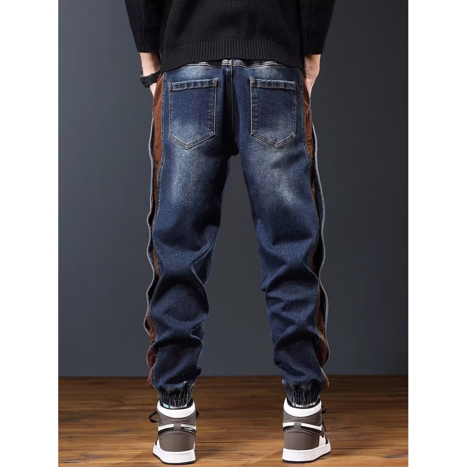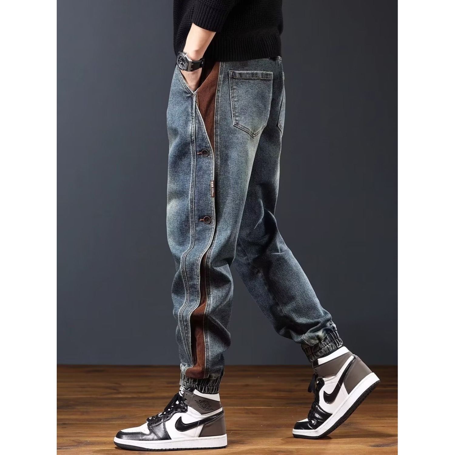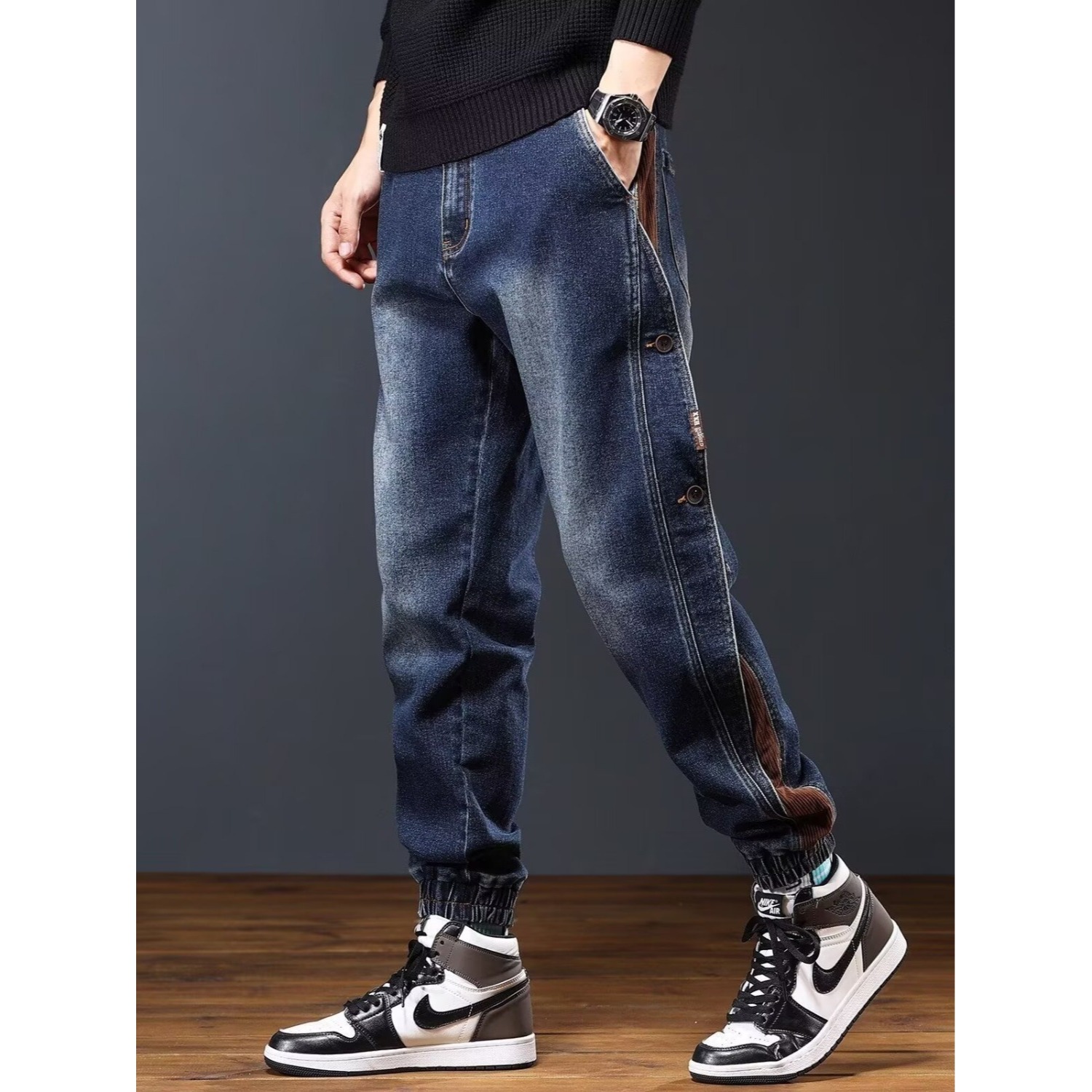 高端宽松直筒牛仔裤男春季新款拼接休闲束脚哈伦裤潮牌复古工装裤