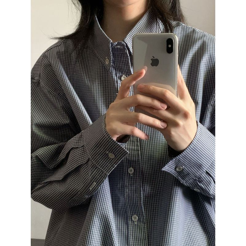 wtmp日系复古设计纽扣小细格长袖衬衫男女秋季宽松格子纯棉衬衣