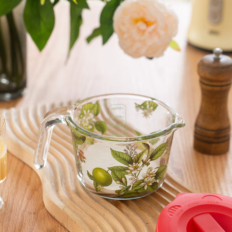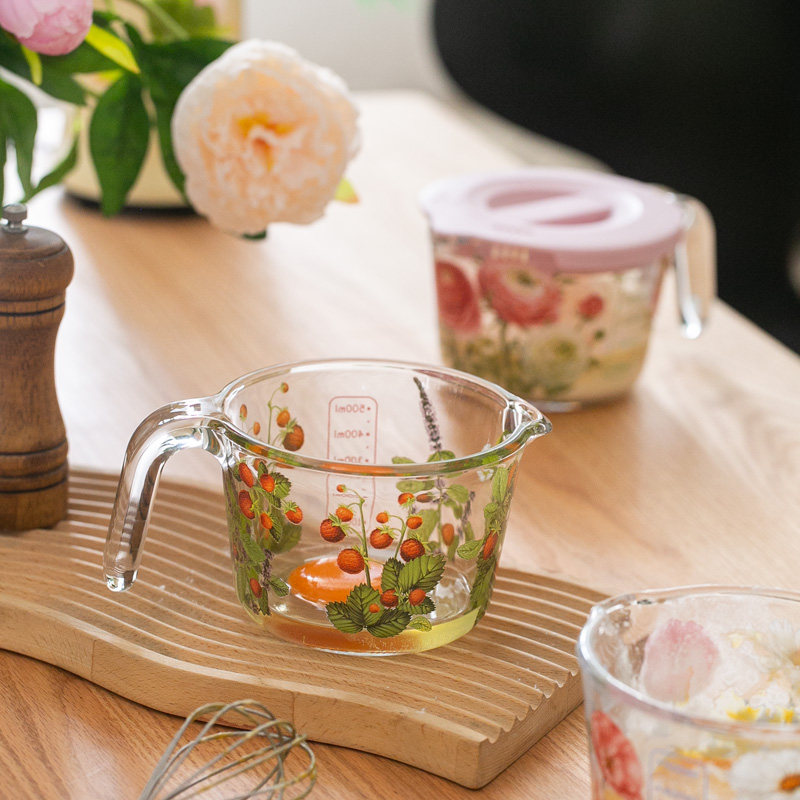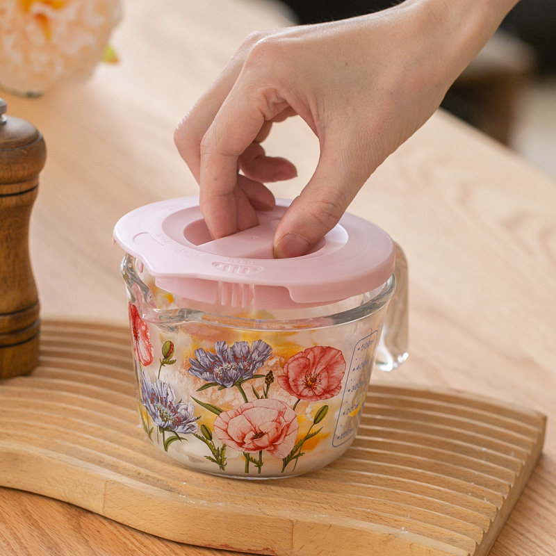 法式 繁花量杯 带盖玻璃杯水牛奶杯 果汁杯带刻度家用 可微波烤箱