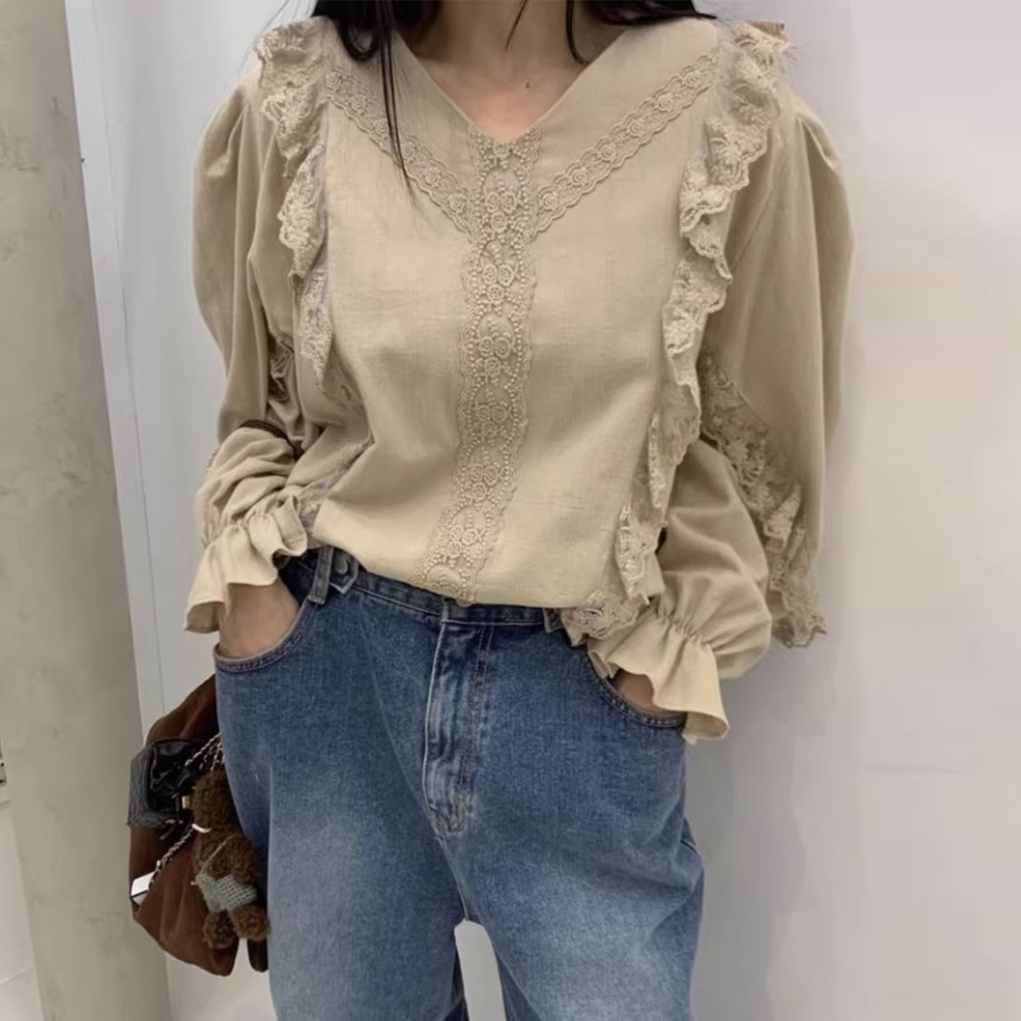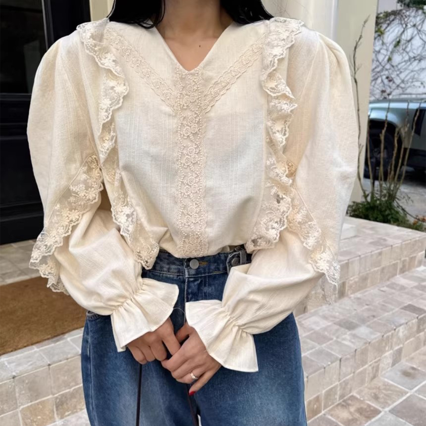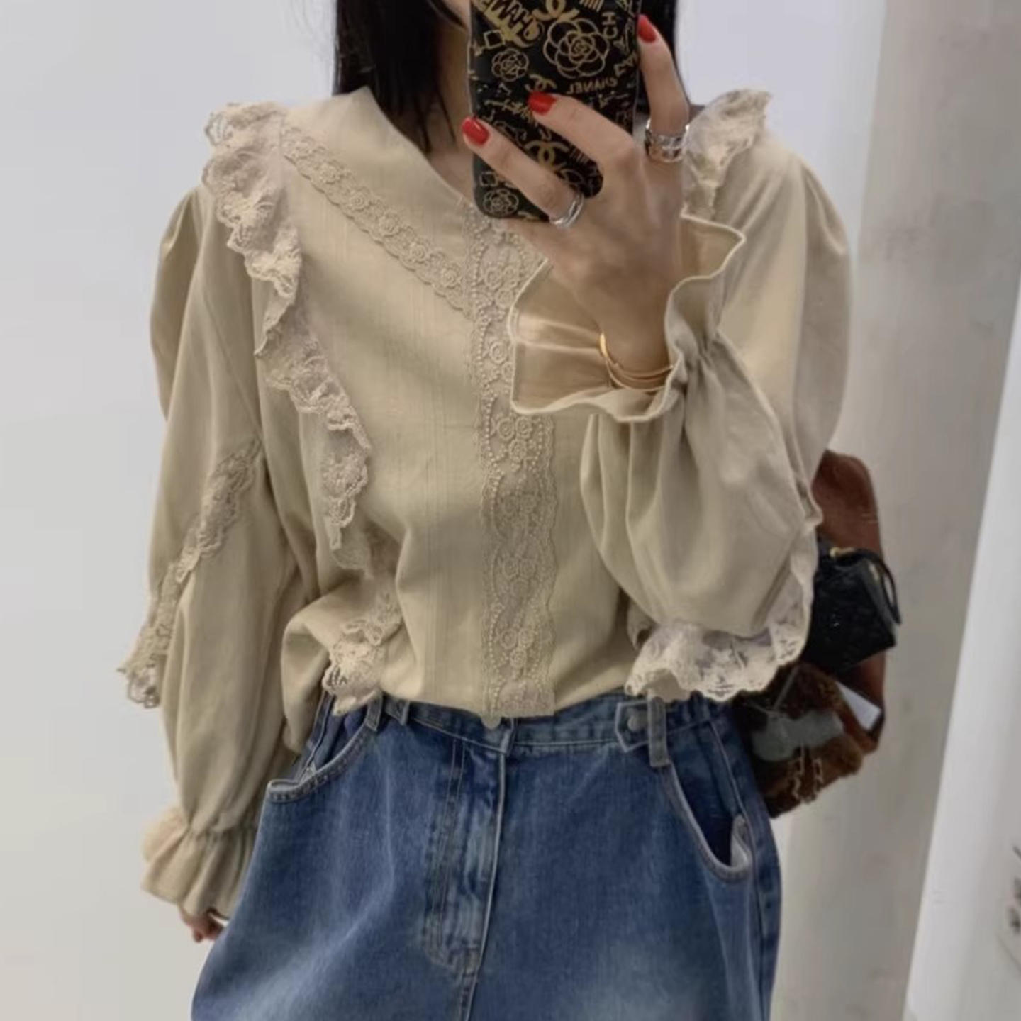 复古减龄重工蕾丝花边拼接V领衬衫女2025秋季新款宽松百搭款上衣
