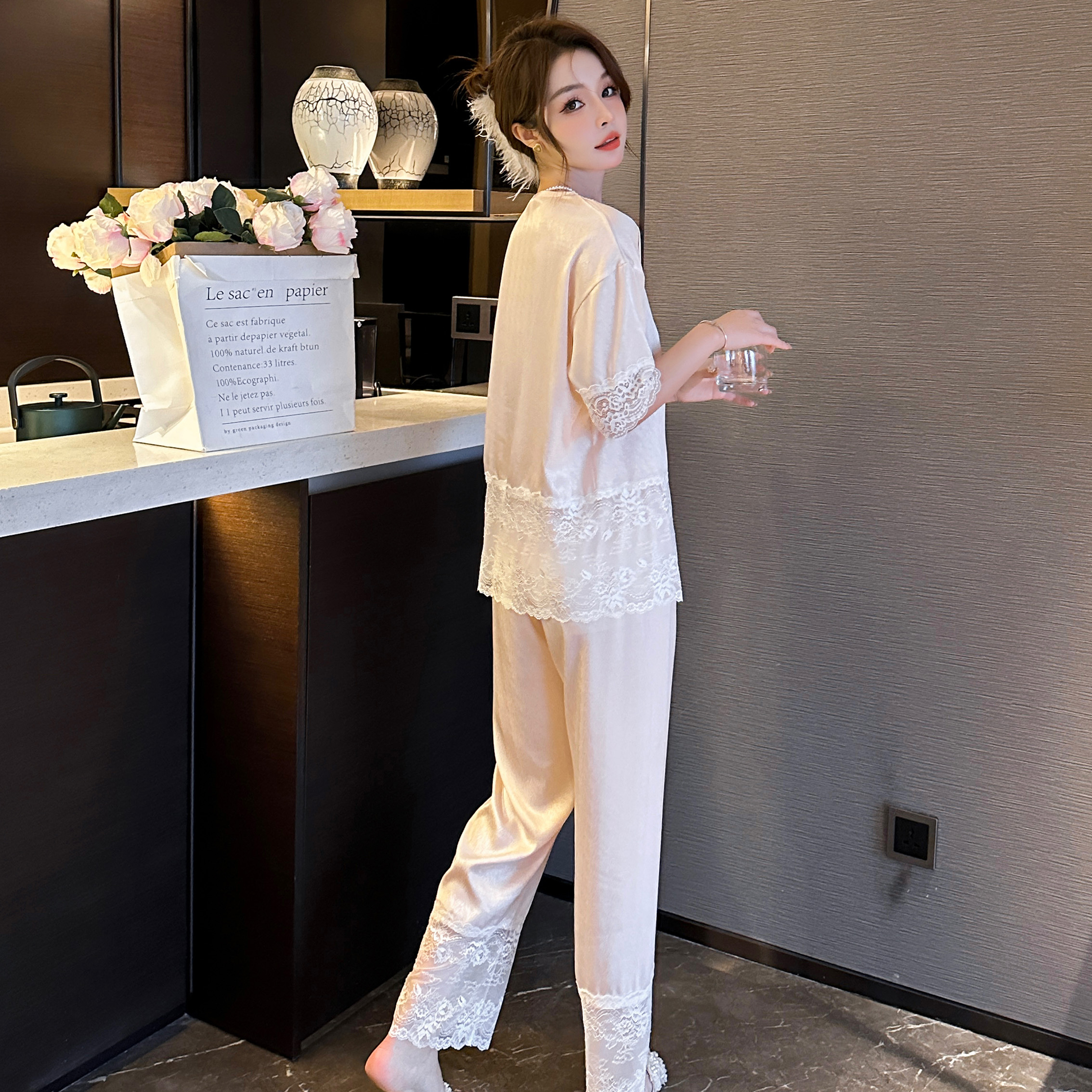维多利亚轻奢真丝性感蕾丝睡衣套装女士夏季新款凉感家居服三件套