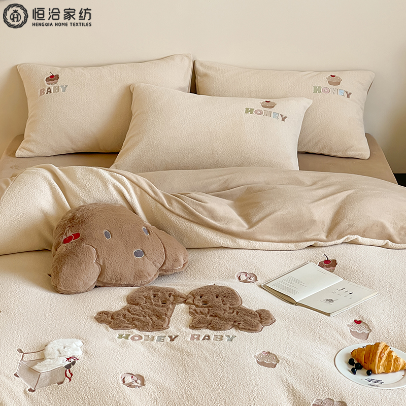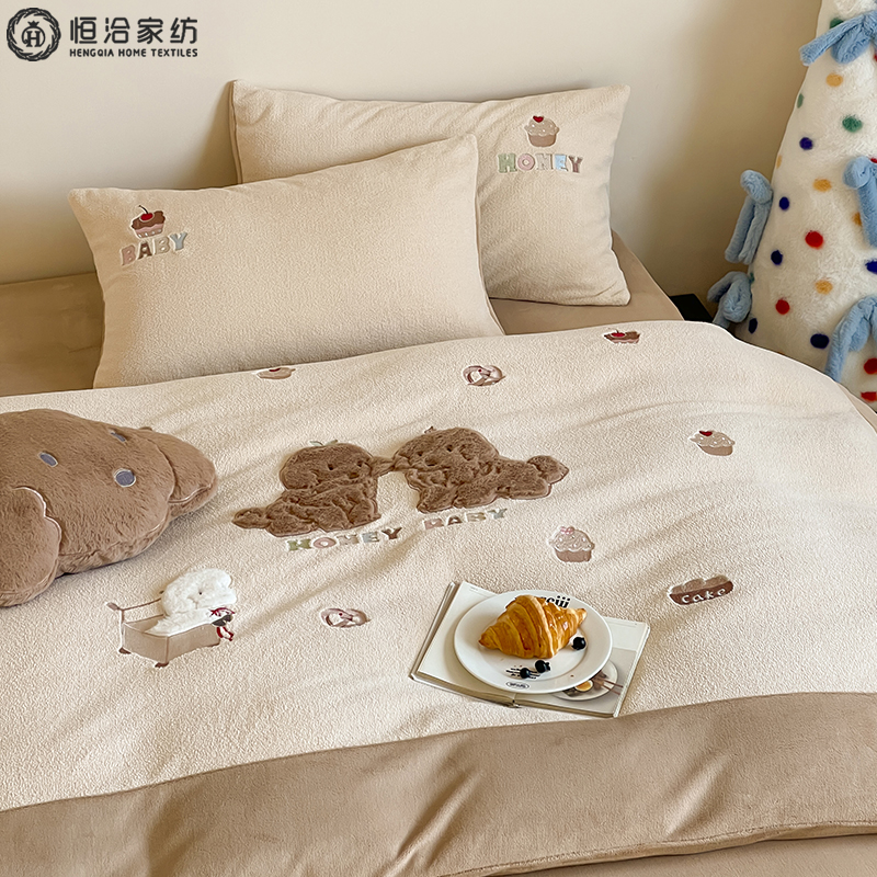 卡通风加厚230G全消光牛奶绒四件套儿童泰迪刺绣保暖被套床品1.2