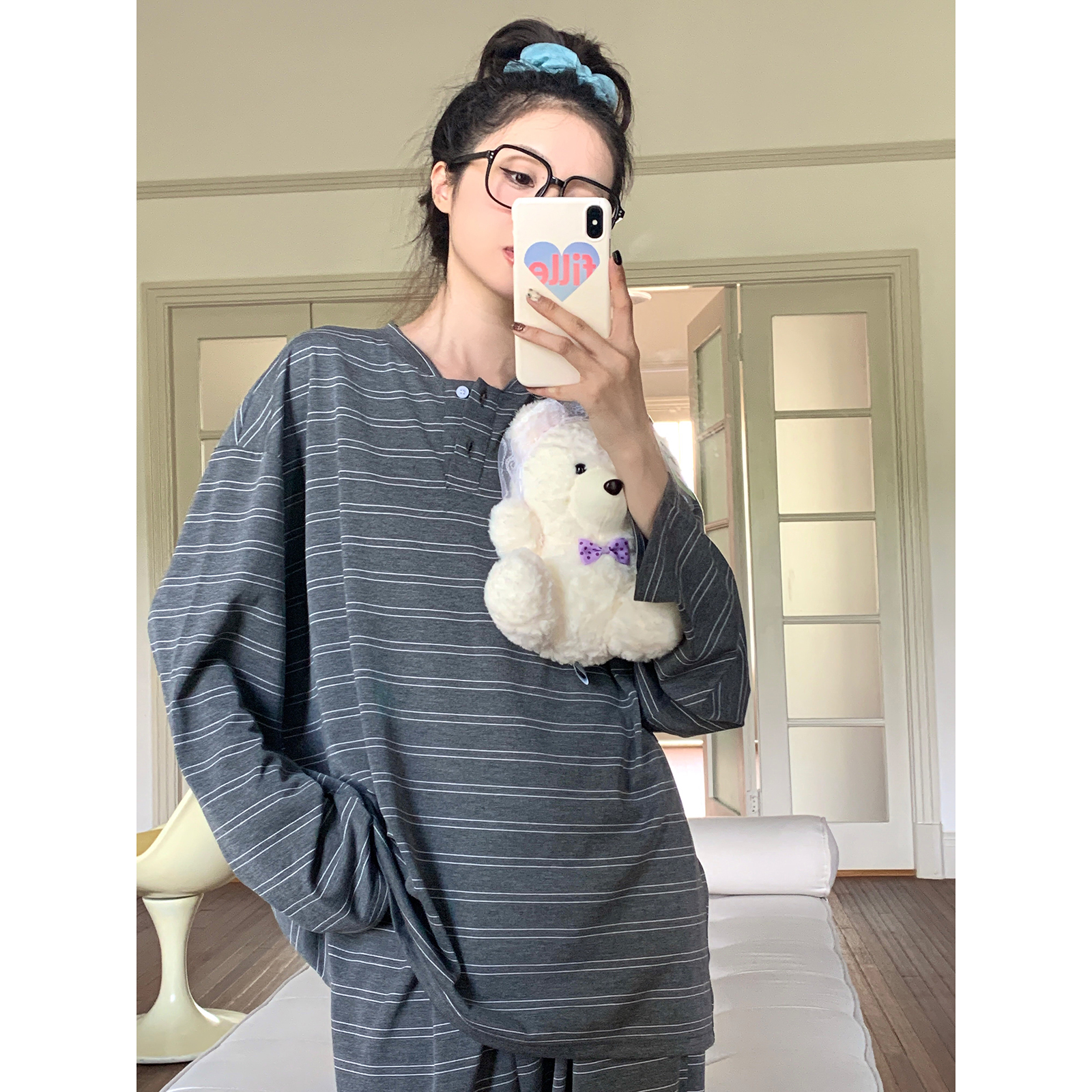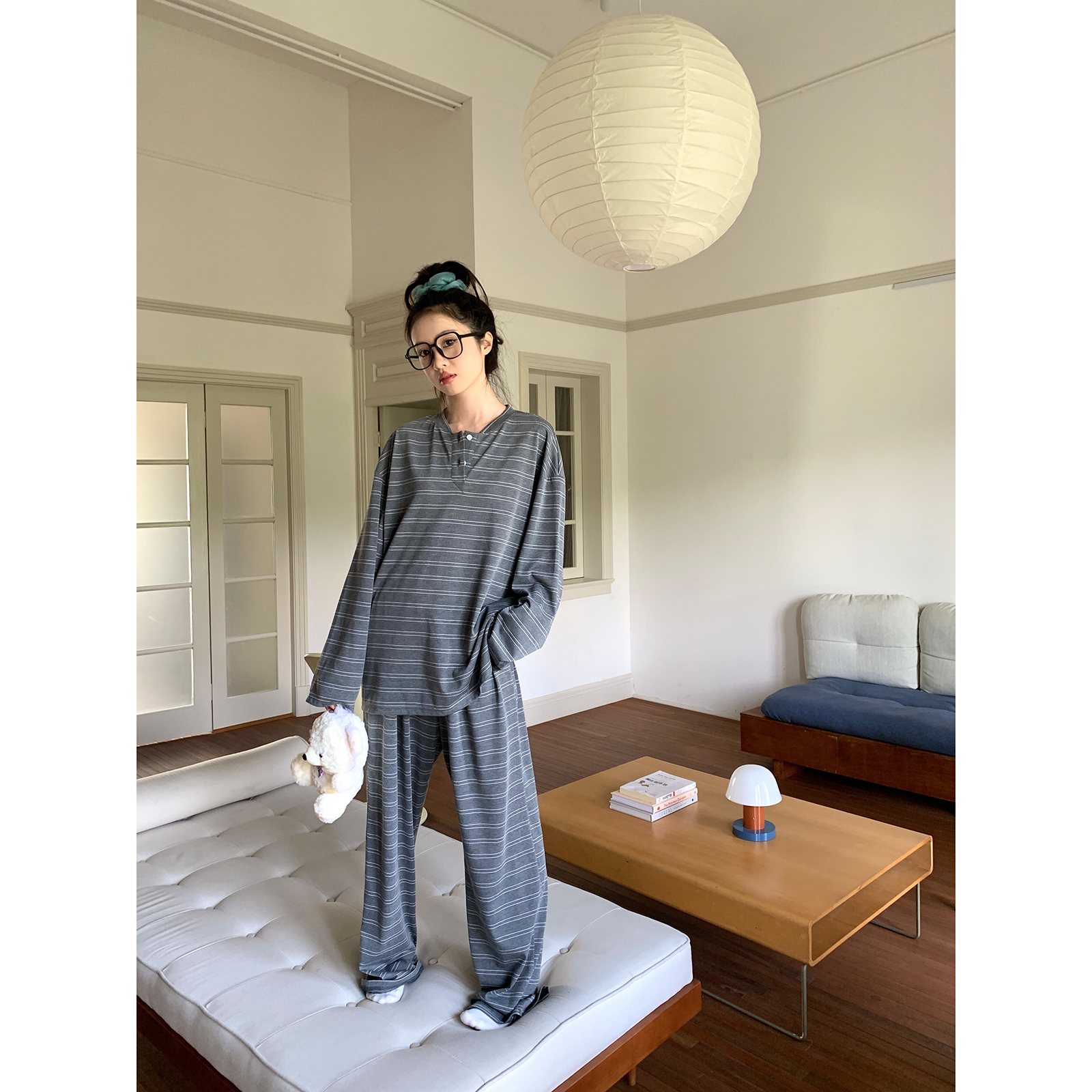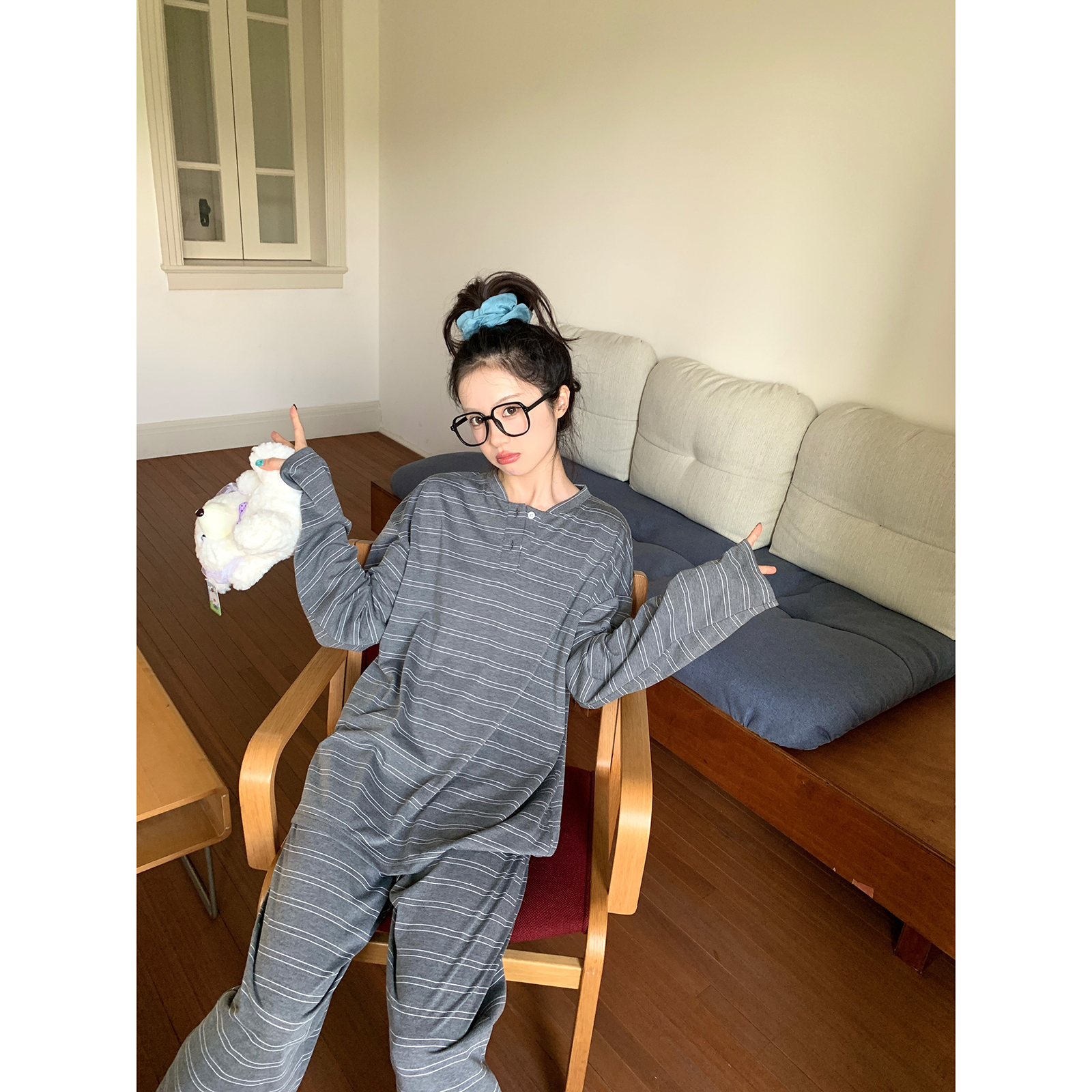 馨帮帮Homedress 简约条纹睡衣女秋季新款休闲长袖长裤家居服套装